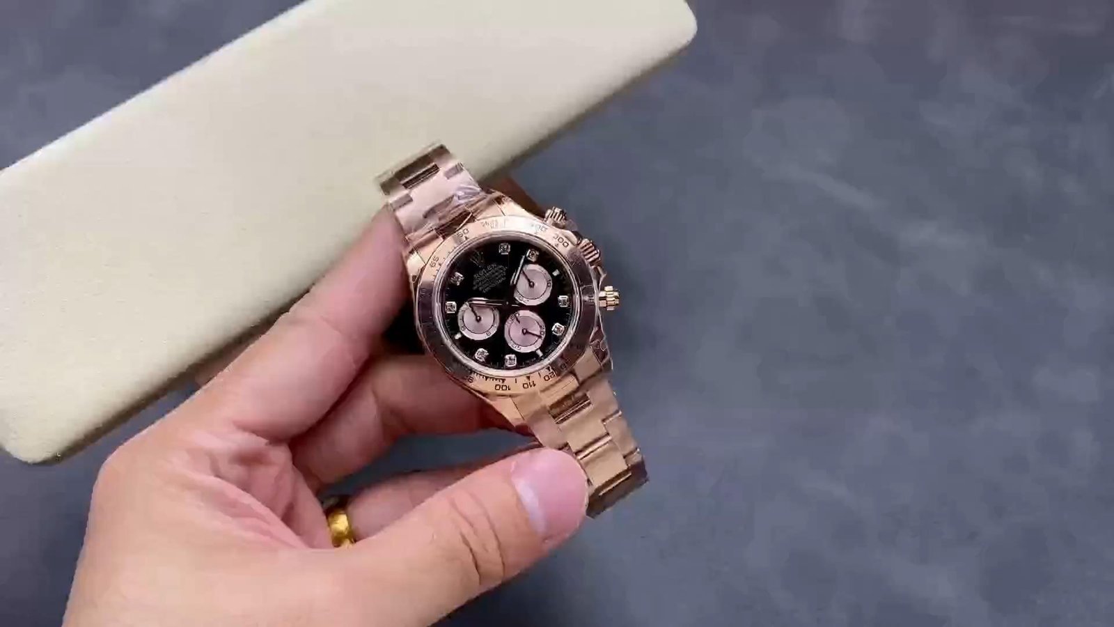 40mm Everose gold case, screwed bottom, triplock triple-seal screw-down crown, fixed bezel with tachymeter scale engraved in 18K Everose gold, scratch-resistant sapphire crystal, shiny black dial with sun dust effect, diamond hour markers, manufactured Rolex Perpetual, mechanical chronograph, automatic movement with central hour and minute hands, small seconds at 6 o’clock, chronograph with central seconds hand, 30 minute counter at 3 o’clock and 12 hour counter at 9 o’clock, seconds stop for exact time. Fit.