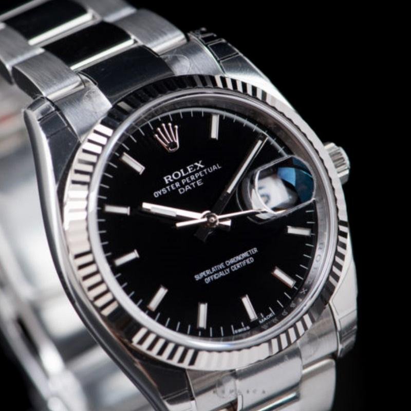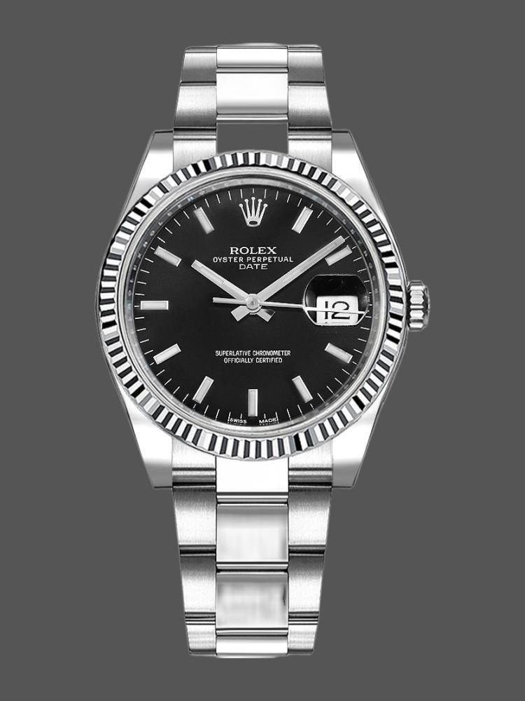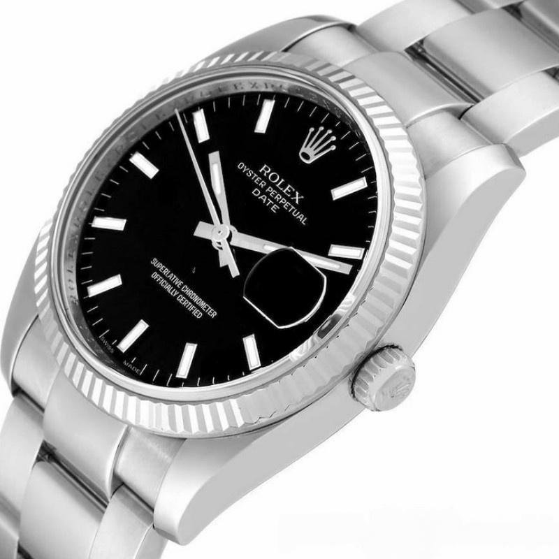 Rolex Oyster Perpetual Date 115234 unisex replica watch, black dial, 34 mm. 34 mm diameter stainless steel case. It features a black cane-shaped dial and a date window at 3 o’clock. Black dial with applied indexes and gold hands, screwed back and crown, sapphire crystal with Cyclops date and white gold fluted bezel. Oyster stainless steel bracelet with safety clasp. Fits 6 3/4″ dolls.