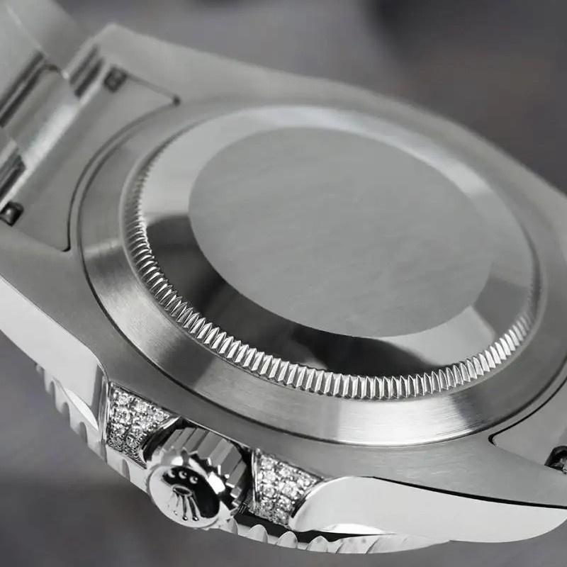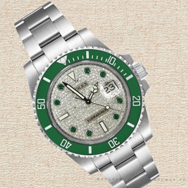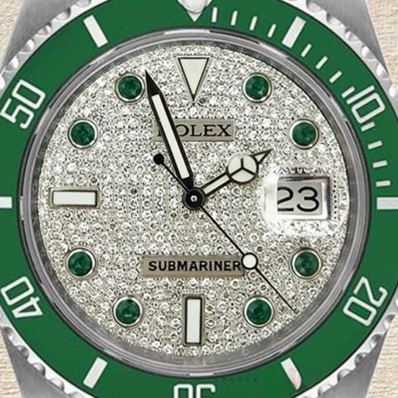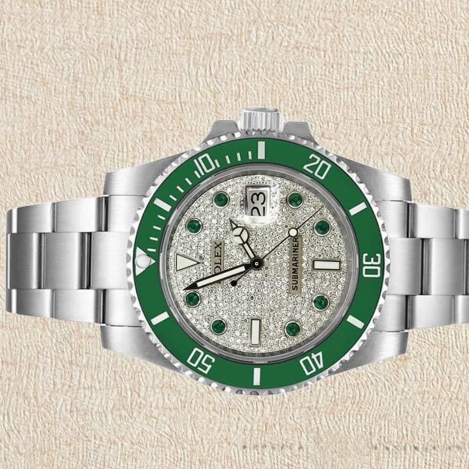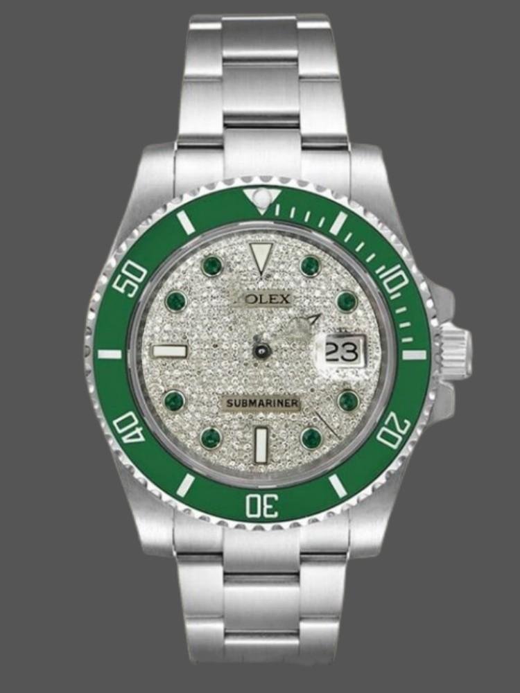 The Rolex Submariner 116610, automatic 40mm replica with pav?? diamond dial for men, features a 40mm round stainless steel case with screw-down crown and a green ceramic bezel. The diamond pav?? dial uses simple diamonds as dial markers instead of Roman numerals to indicate the time. Recorded 60-minute scale and graduations on the bezel. Numbers, date window with magnifying glass at 3 o’clock, sapphire crystal, unidirectional rotating bezel. The reliable stainless steel Oyster bracelet will look perfect on your wrist.