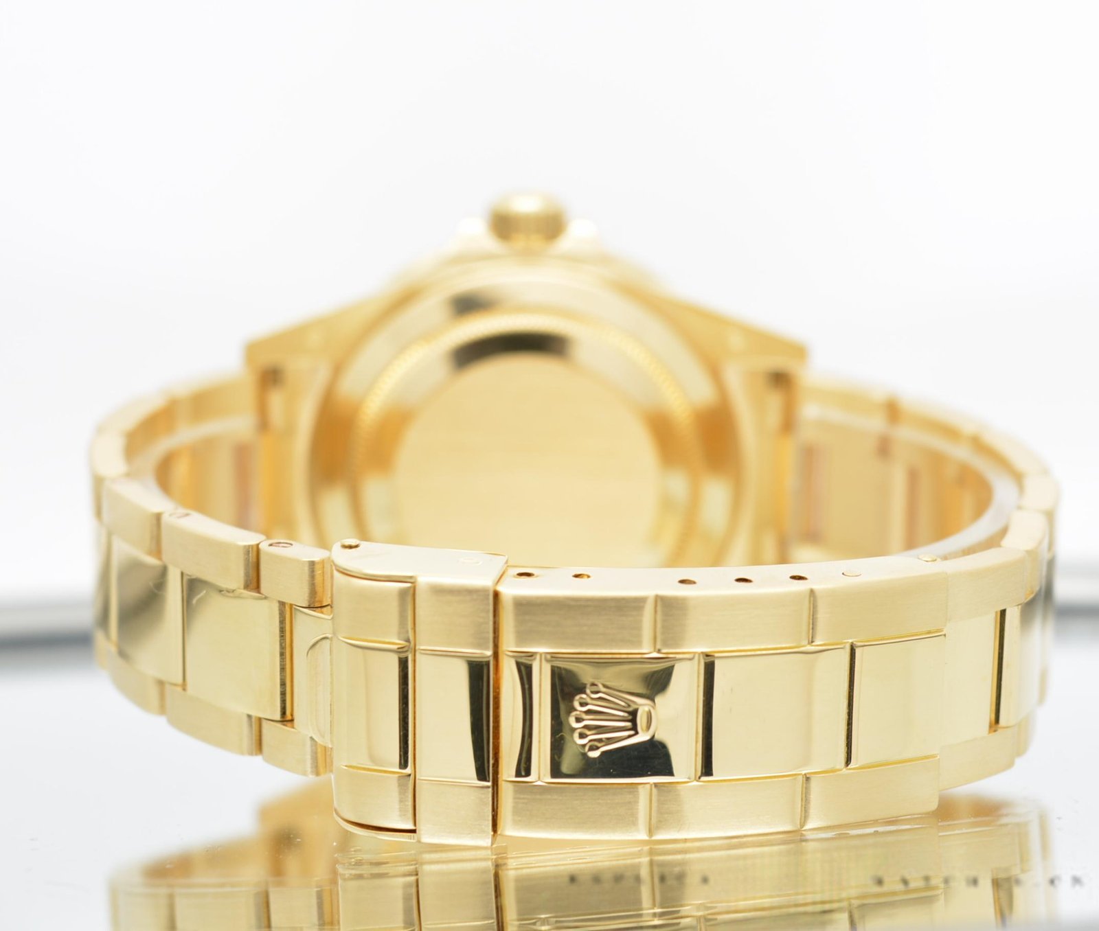 Rolex Submariner 16618 replica watch for men, yellow gold, black dial, 40 mm. 40 mm diameter yellow gold case. Unidirectional rotating bezel with special time-lapse with black insert. Scratch resistant sapphire crystal with Cyclops magnifying glass. Black dial with luminescent hour markers. Luminescent hands. Calendar window at 3 o’clock. Matching yellow gold Oyster bracelet with polished center links and safety clasp.