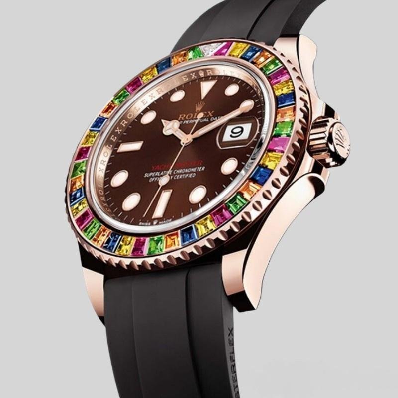 Rolex Yacht-Master 116695 replica watch for men, black rubber strap, brown dial, 40 mm. 40mm Everose gold case and diamond bezel. The brown dial has luminescent hands and dotted hour markers. Date window under a cyclops lens at 3. Screwed caseback. Black rubber strap. Foldable safety buckle with quick extension system.