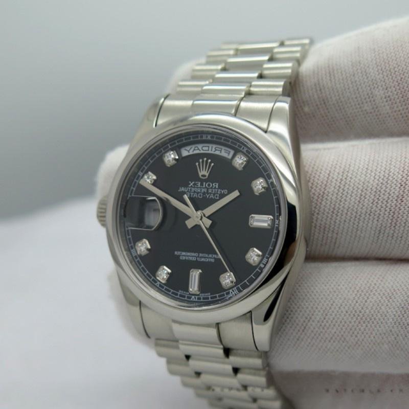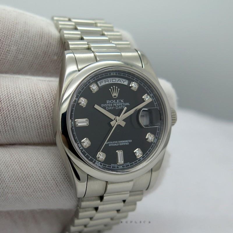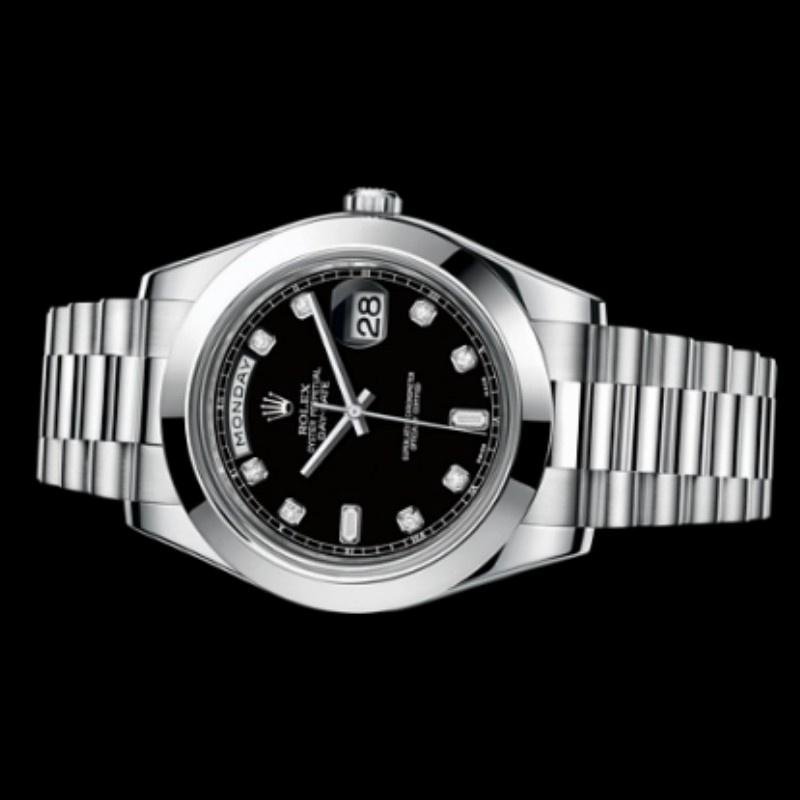 Rolex Day-Date 218206 Men’s Watch, 41mm Platinum Replica with Black Dial and Diamonds. It features a 41mm round platinum case with screw-down crown and platinum bezel. Scratch resistant sapphire crystal with Cyclops magnifying glass. Black dial with diamond hour markers. Baguette cut diamonds on the hour markers at 6 and 9. Date window at 3 and day window at 12. The platinum President bracelet will look perfect on your wrist.