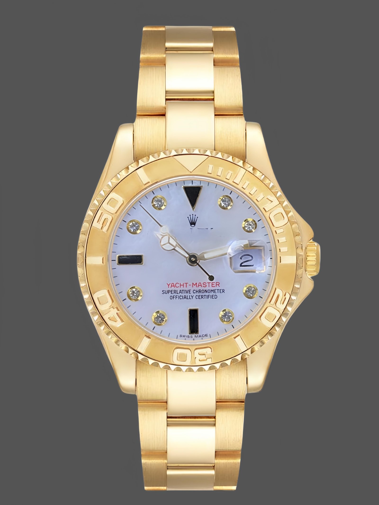 Rolex Yacht Master 168628 Women’s watch with white mother-of-pearl dial and diamonds, 35 mm yellow gold case