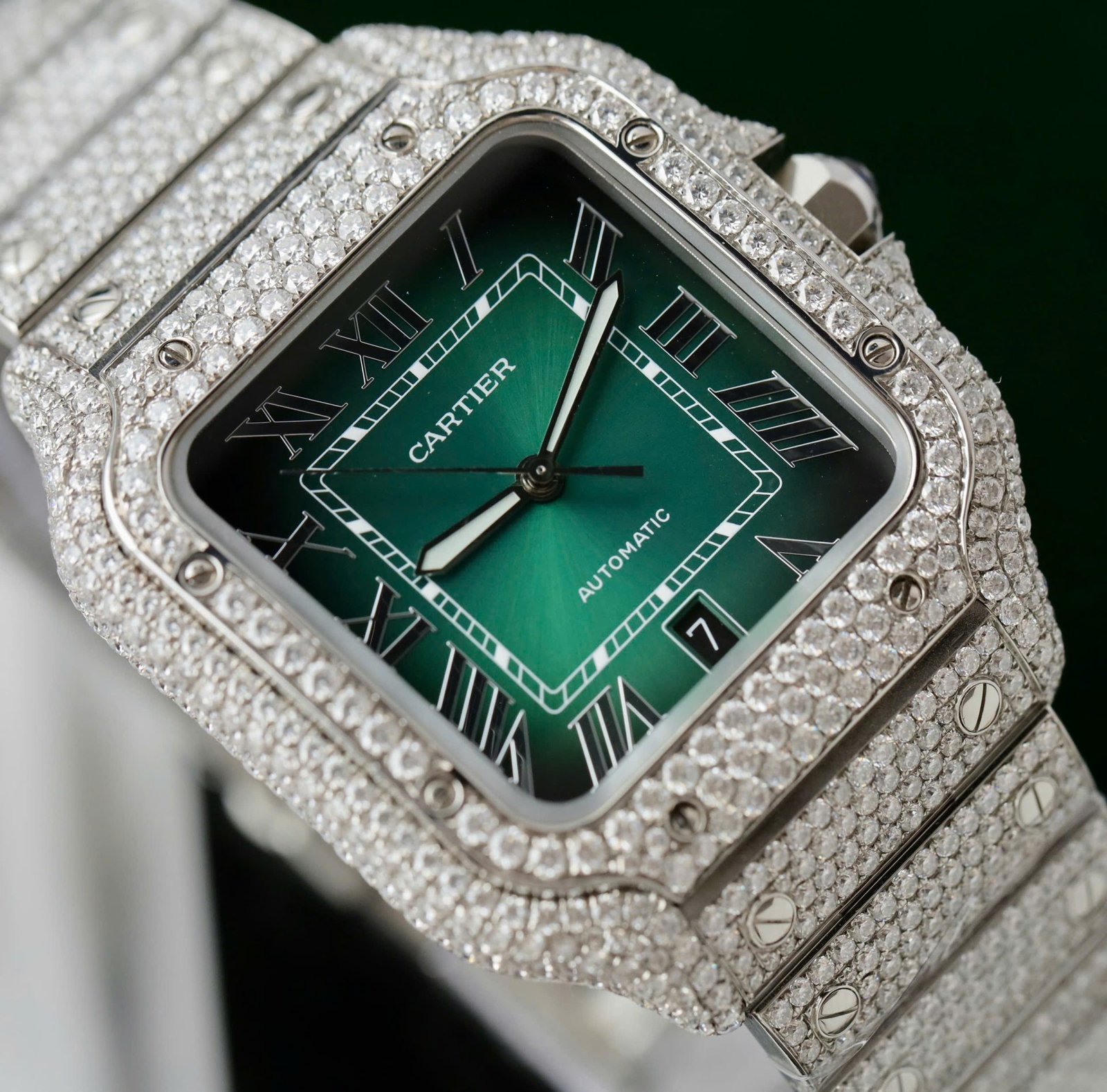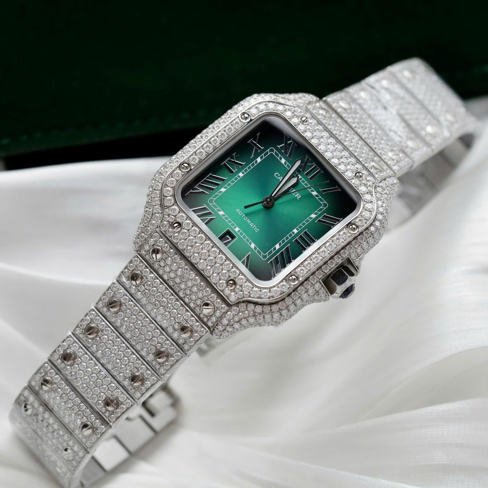 Cartier Santos watch with green dial, replica, personalized diamonds, factory moissanite BV, 39.8 mm