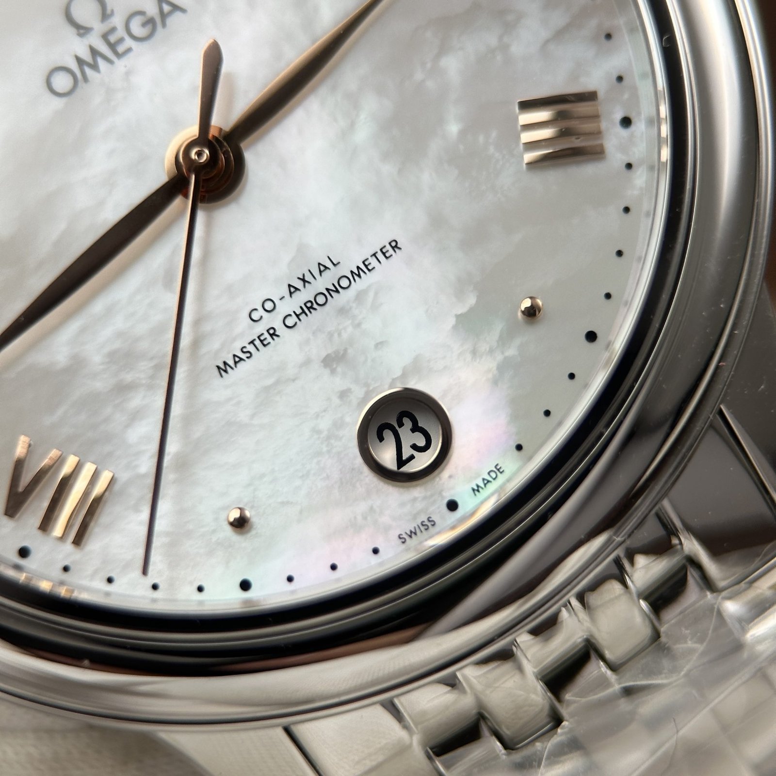 Omega De Ville Prestige imitation watches with 34 mm white mother-of-pearl dial