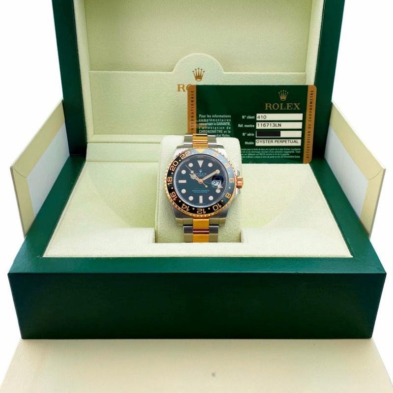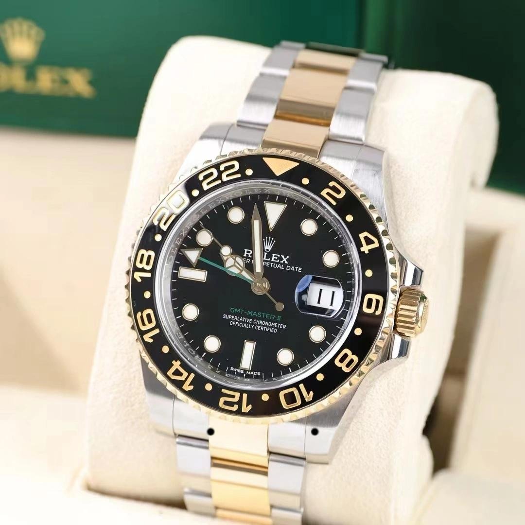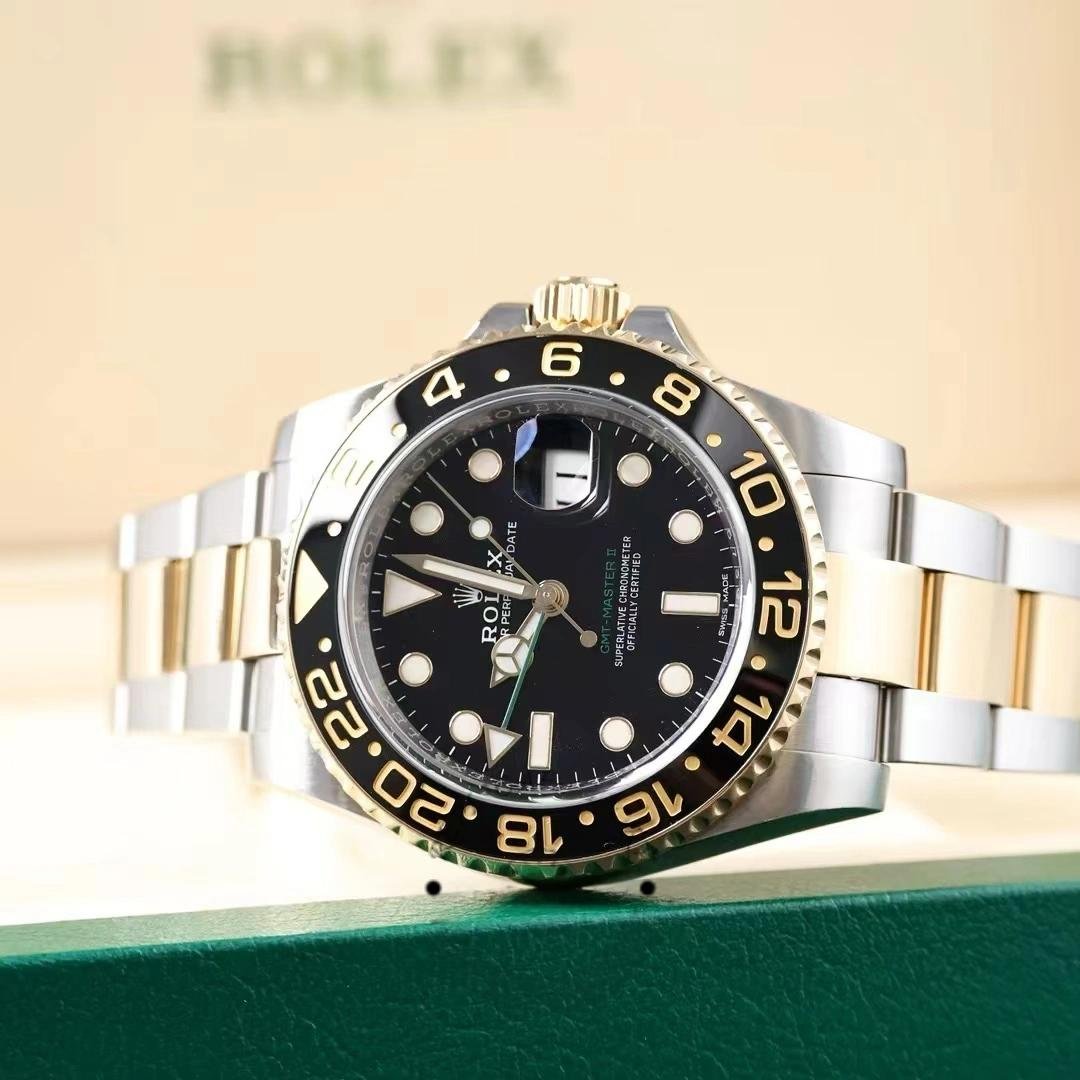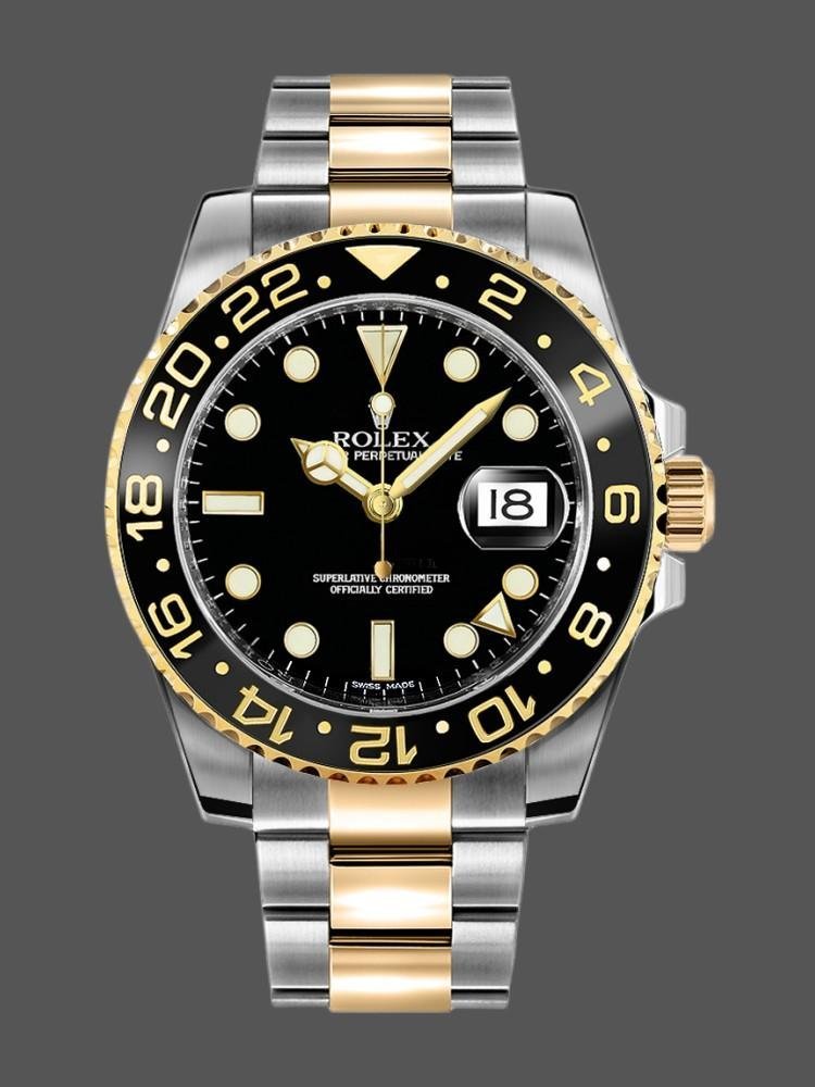 Rolex GMT-Master II 116713LN men’s replica watch, stainless steel case, black dial, 40 mm. 40mm stainless steel case. Two-way yellow gold bezel with black ceramic insert. 24-hour engraved numbers and graduations on the bezel. Black dial with luminescent Mercedes steel hands and hour markers. Minute markers on the outer dial. Date display at 3. Stainless steel and yellow gold bracelet with Oysterlock folding safety clasp by Oystersteel.