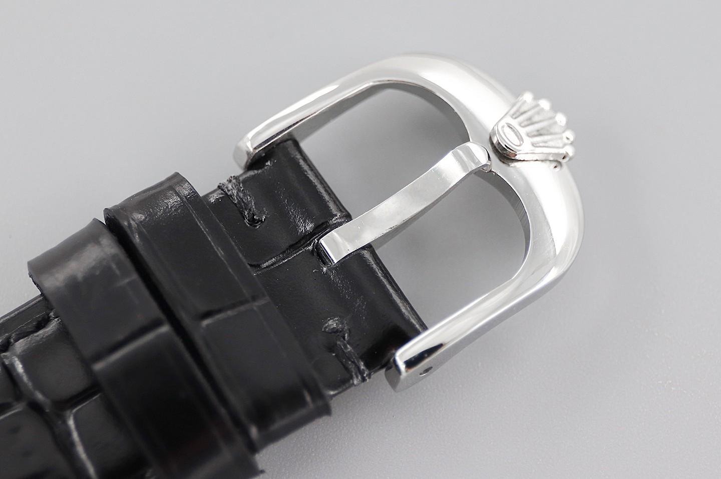 The Rolex Cellini Date 50519, men’s replica in black leather and 39mm black dial, features a round 39mm white gold case with screw-down crown and white gold bezel. Scratch resistant sapphire crystal. Guilloch?? black dial with sunray effect and polished embossed cane-type hour markers. Elegant printed minutes and seconds indicator. Date subdial in the 3 o’clock window. The black leather bracelet will look perfect on your wrist with a white gold herringbone buckle.