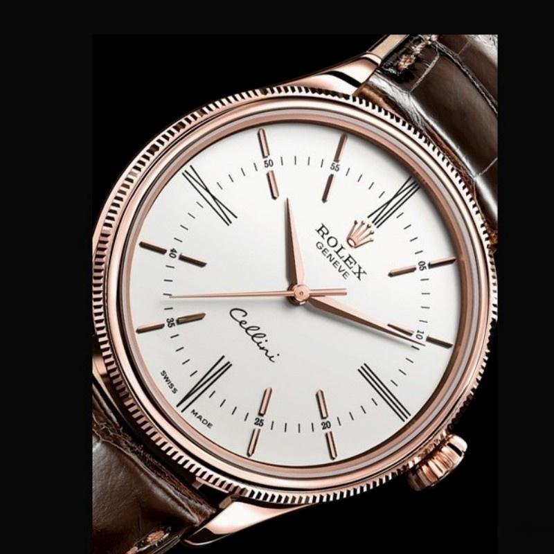 Rolex Cellini Time 50505 replica watch for men, with brown leather strap and white dial, 39 mm. 39mm diameter round rose gold case. Fixed double bezel, domed and fluted, in polished solid Everose gold. Scratch resistant sapphire crystal. White dial with polished rose gold embossed cane indexes. Printed minutes and seconds indicator. Rose gold hour, minute and second center hands. Custom brown leather strap with rose gold herringbone buckle.