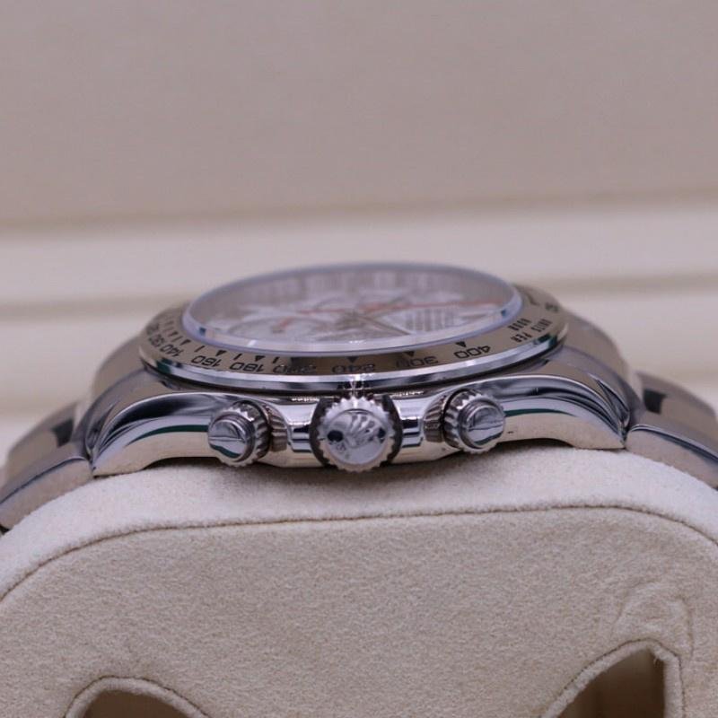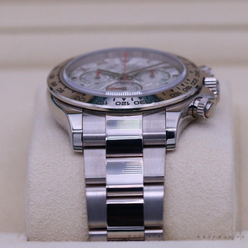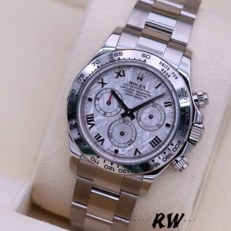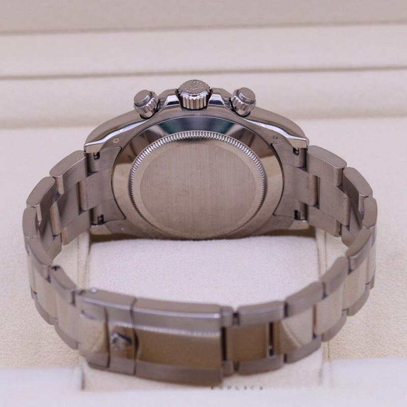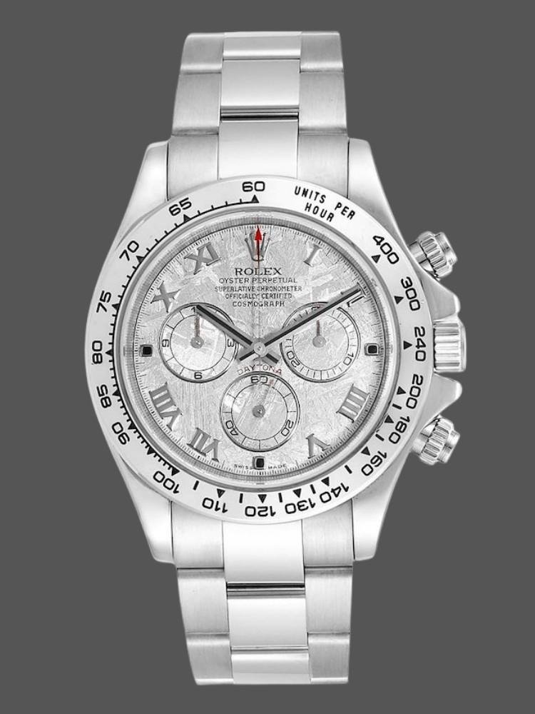 The Rolex Cosmograph Daytona 116509 Meteorite Gray Roman Dial 40MM for men, replica of the watch, it has a 40 mm white gold case, meteorite gray dial with hour markers in Roman numerals, subdial with 30-minute counter at 3, subdial with 12-hour counter at 9, subdial with small seconds hand at 6, sapphire crystal and white gold Oyster bracelet with safety clasp.
