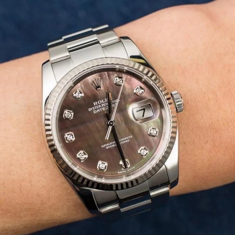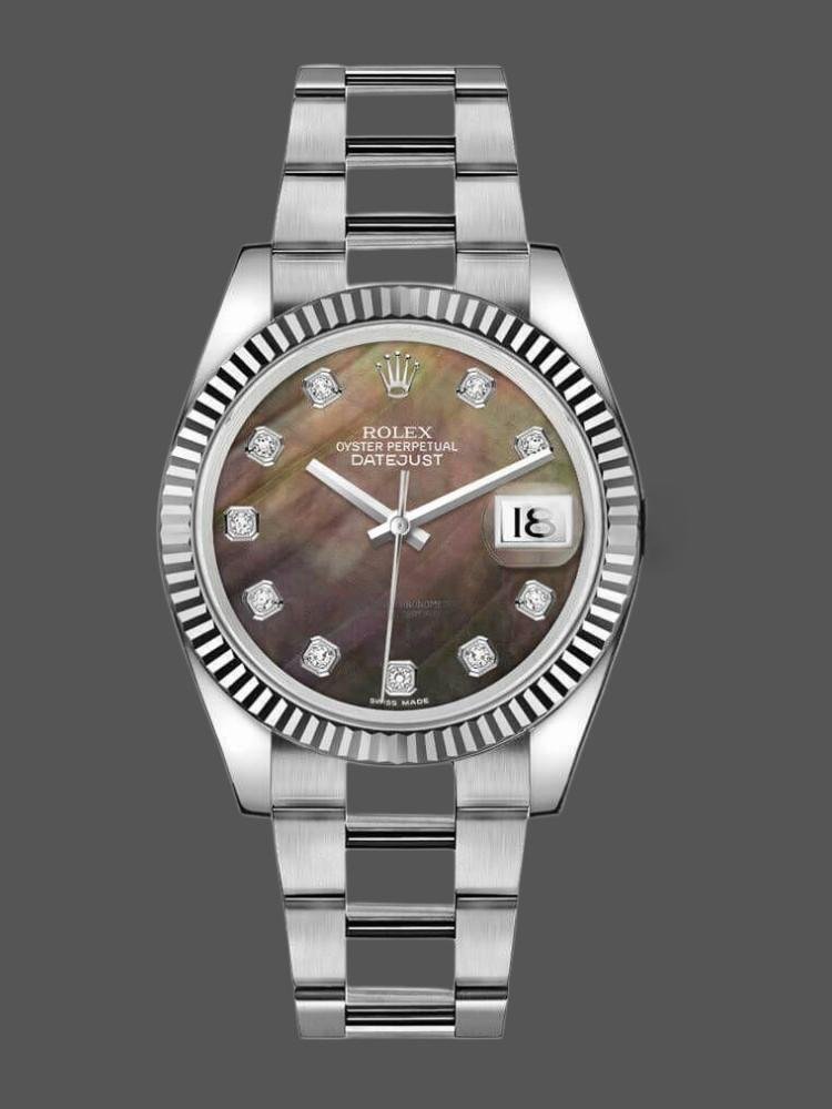 Rolex Datejust 116234 – 36mm automatic unisex replica with black mother-of-pearl dial and diamonds. This watch will become the jewel of your luxury watch collection. Round stainless steel case and bracelet, fixed white gold ribbed bezel. Black mother-of-pearl dial adorned with small diamonds and wide hands. Date display at 3 o’clock. Stainless steel Oyster bracelet with folding clasp.