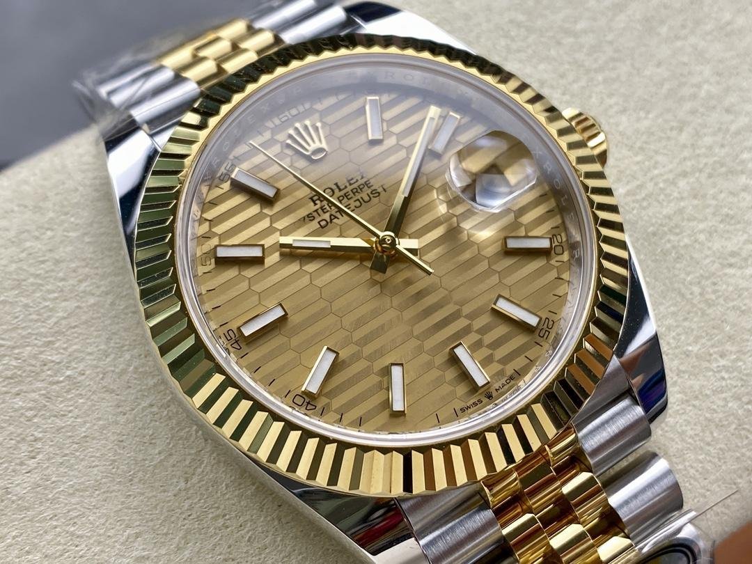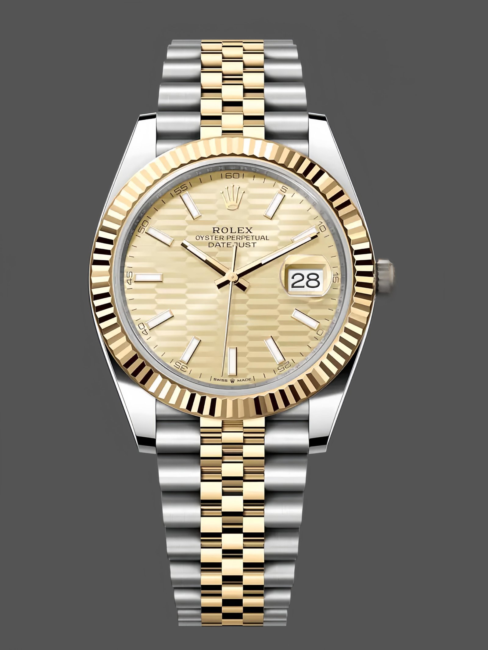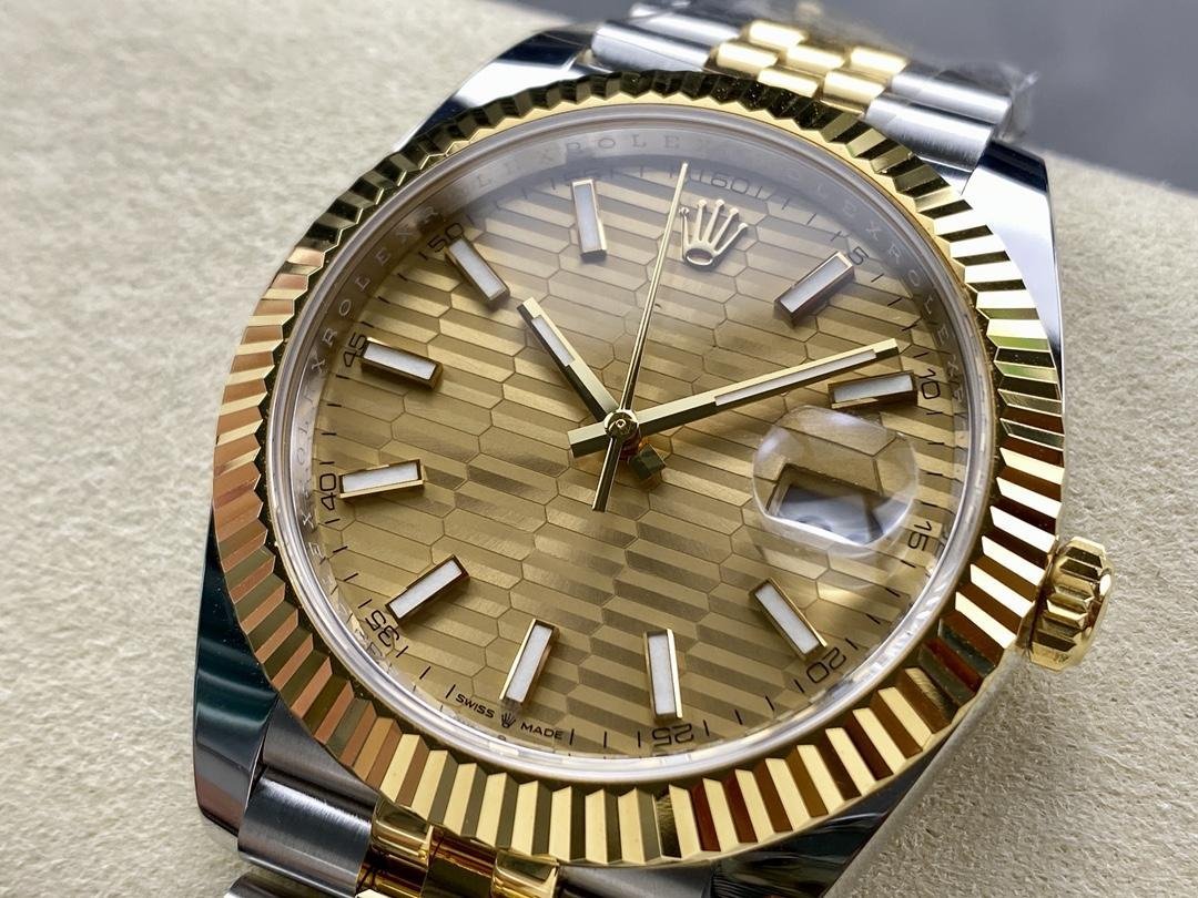 Rolex Datejust 126233 unisex replica watch with champagne dial and 36 mm fluted bezel. 36 mm yellow Rolesor case with Oystersteel monobloc case, screwed steel caseback, screwed yellow crown and yellow fluted bezel. The gold dial features a fluted motif, hour indexes and date visible under a Cyclops lens in the window at 3 o’clock with instant date and quick adjustment. Yellow Rolesor Jubilee bracelet with five-piece links and Oysterclasp folding clasp with Easylink extension.