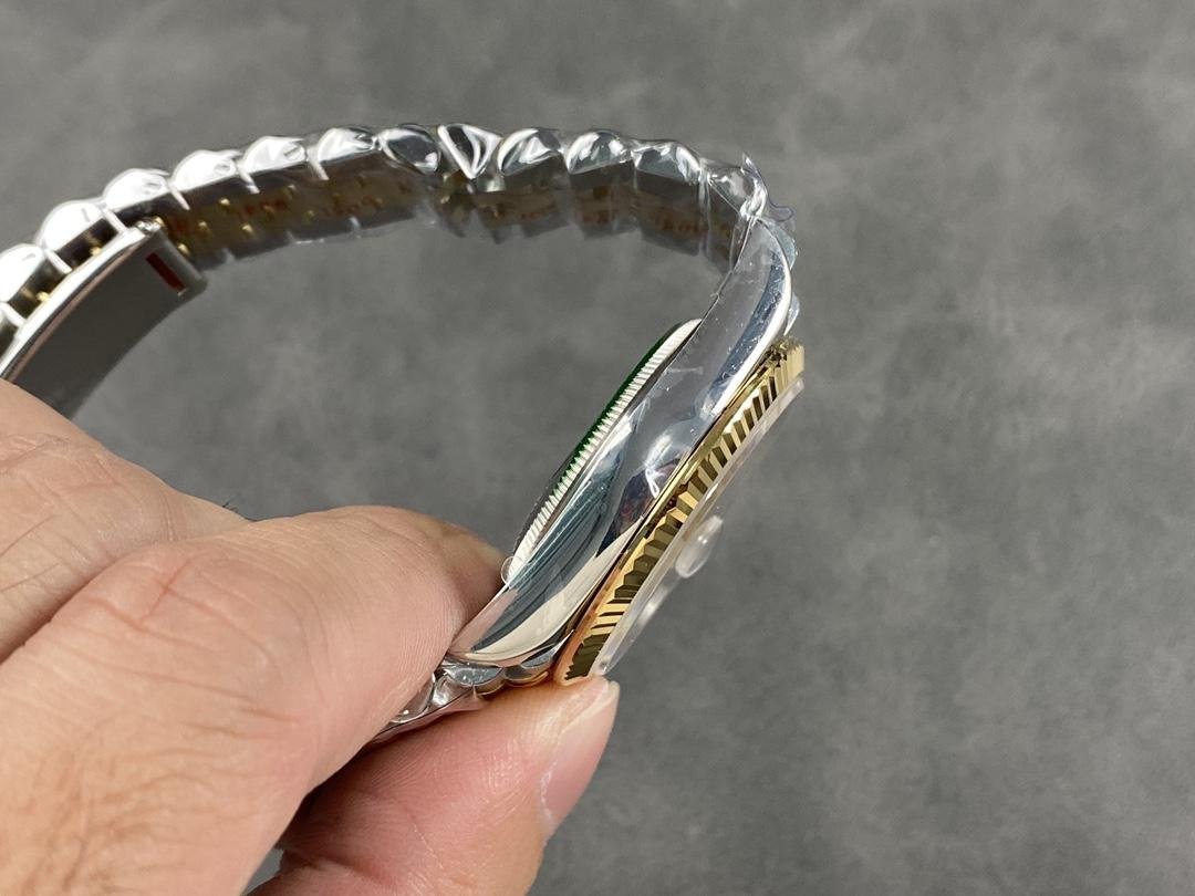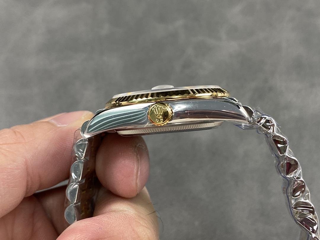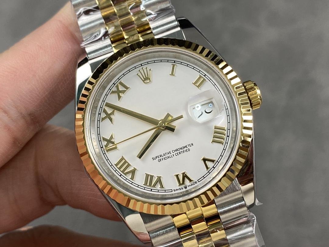 Rolex Datejust 126233 unisex replica watch with white Roman dial and 36 mm fluted bezel. 36mm yellow Rolesor case with Oystersteel monobloc case, screwed steel caseback, yellow screw-down crown, yellow fluted bezel, white dial with Roman numeral hour markers. Date visible under a Cyclops lens in the window at 3 o’clock, with instant date and quick adjustment. Yellow Rolesor Jubilee bracelet with five-piece links, Oysterclasp folding clasp with Easylink extension.