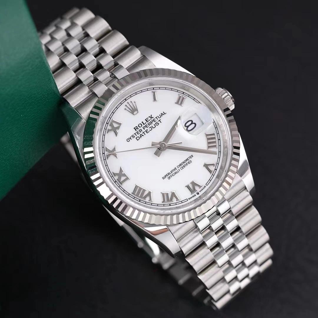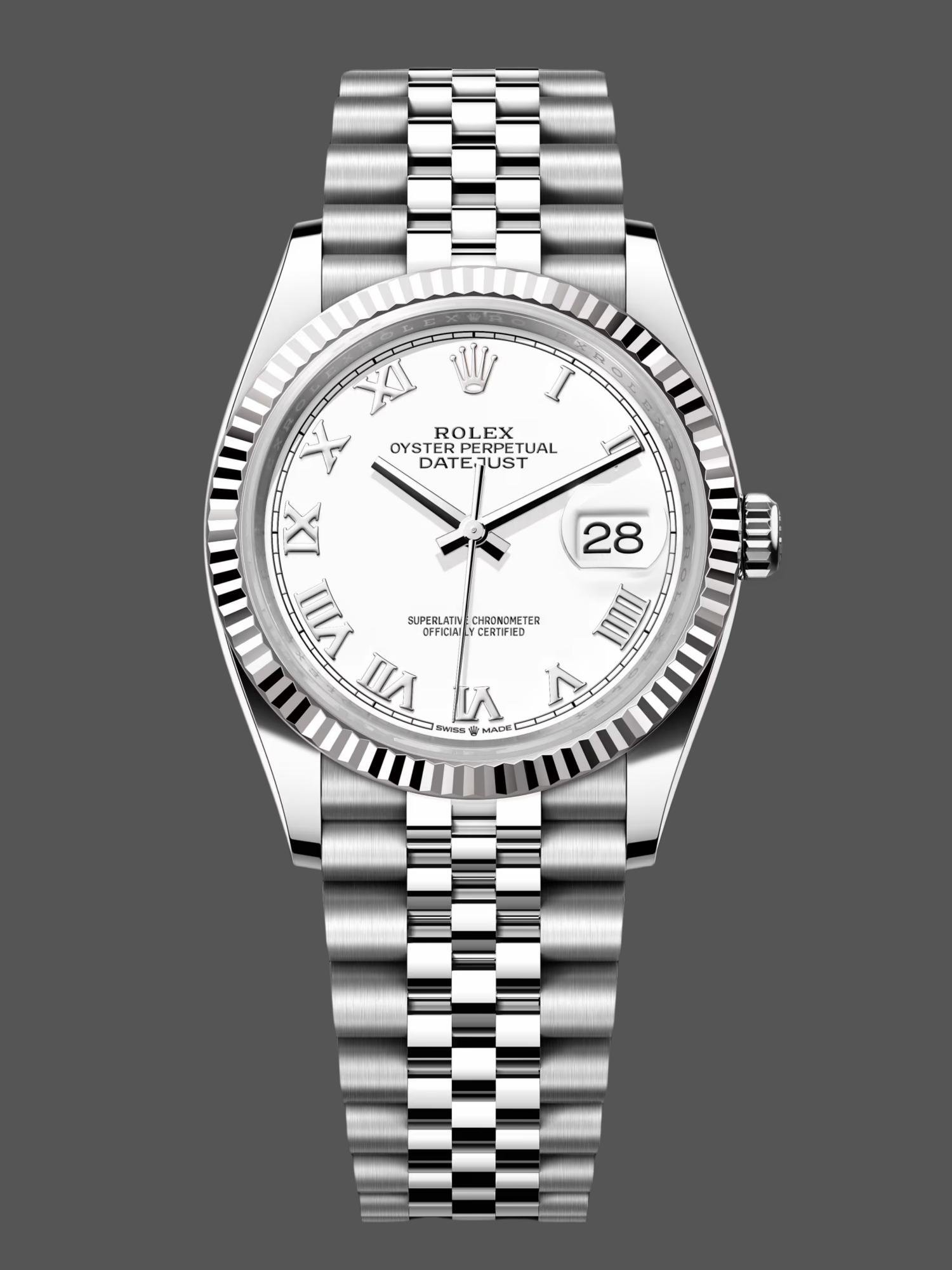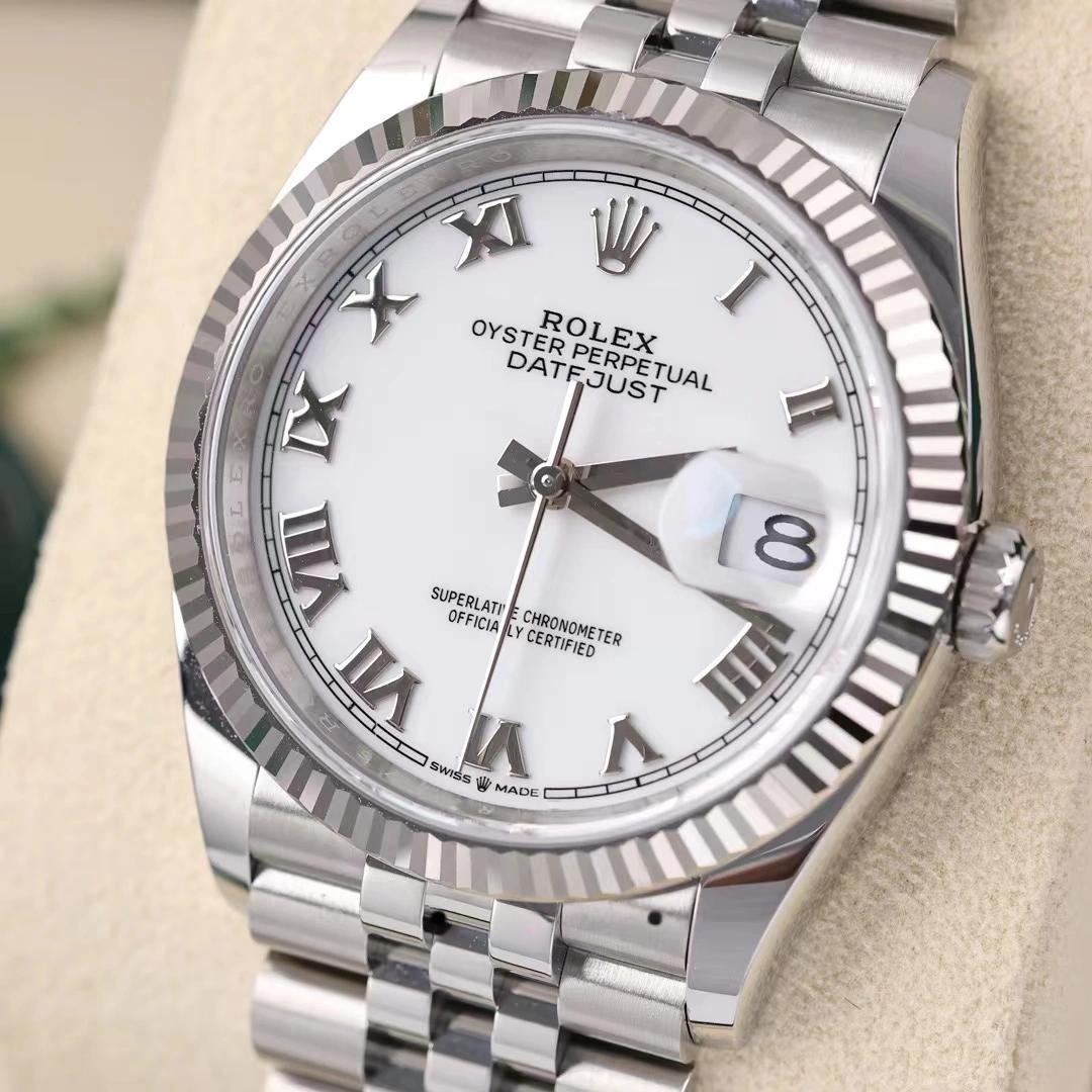 Replica Rolex Datejust 126234 unisex watch with fluted bezel and 36mm white Roman dial
