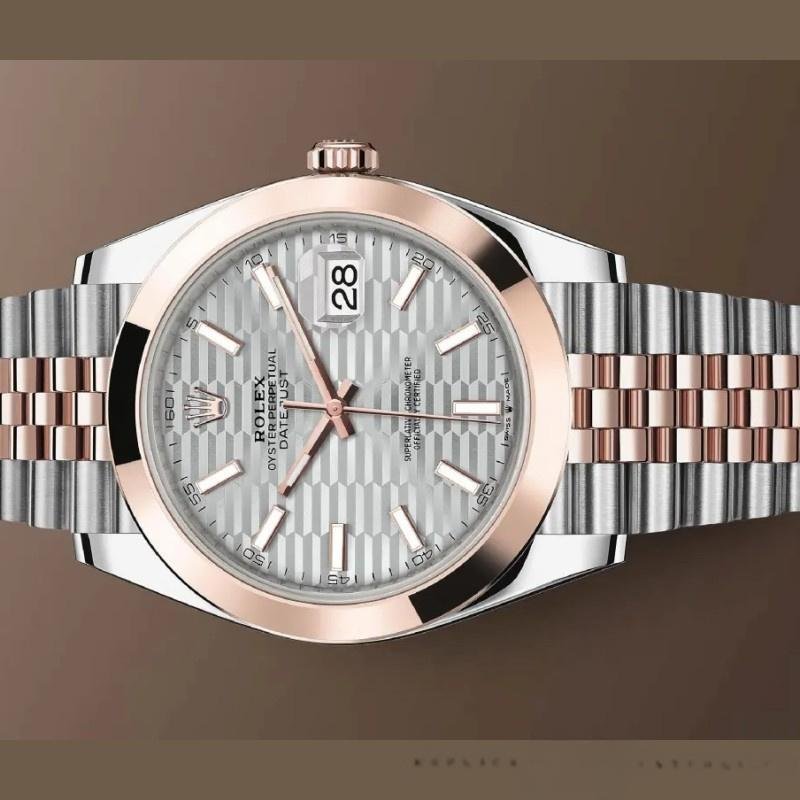 Rolex Datejust 126301 replica watch for men, rose gold, slate gray dial with striated motif, 41 mm. 41mm Rolesor Everose case with steel monobloc case, steel screwed back, Everose gold screwed crown, smooth Everose gold bezel, double scratch-resistant anti-reflective sapphire crystal and Cyclops lens on the date. Slate gray dial with fluted motif and hour markers. Date at 3 o’clock that changes instantly at midnight in a few thousandths of a second. Everose Jubilee steel and Everose gold Rolesor bracelet with five-piece links. OysterClasp folding buckle with comfortable Easylink extension closure.