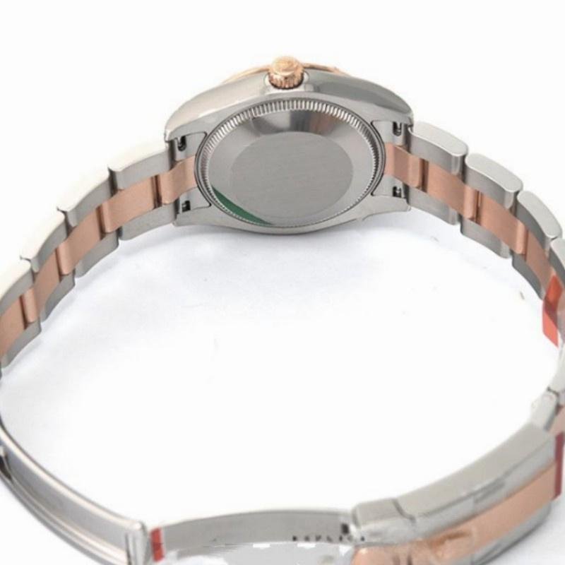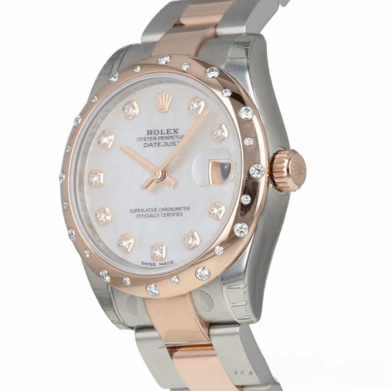 31mm Rolex Datejust 178341 women’s replica watch with white mother-of-pearl dial and diamonds. It features a 31 mm case in rose gold and stainless steel. White mother-of-pearl dial set with diamonds and rose gold domed bezel with 24 scattered diamonds. Engraved interior bezel. Sapphire crystal. Comes in two shades with stainless steel and rose gold bracelet and folding clasp.