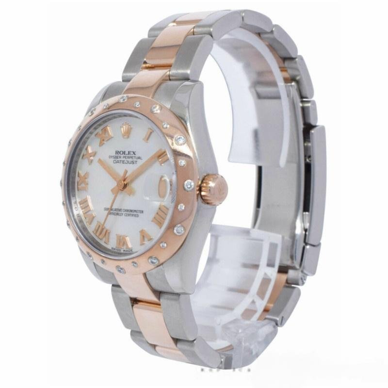 Rolex Datejust 178341 women’s watch, replica, white mother-of-pearl dial, 31 mm, rose gold and stainless steel. White mother-of-pearl dial with Roman numerals and rose gold domed bezel with 24 scattered diamonds. Engraved interior bezel. Sapphire crystal. Two-tone stainless steel and rose gold bracelet with folding clasp.