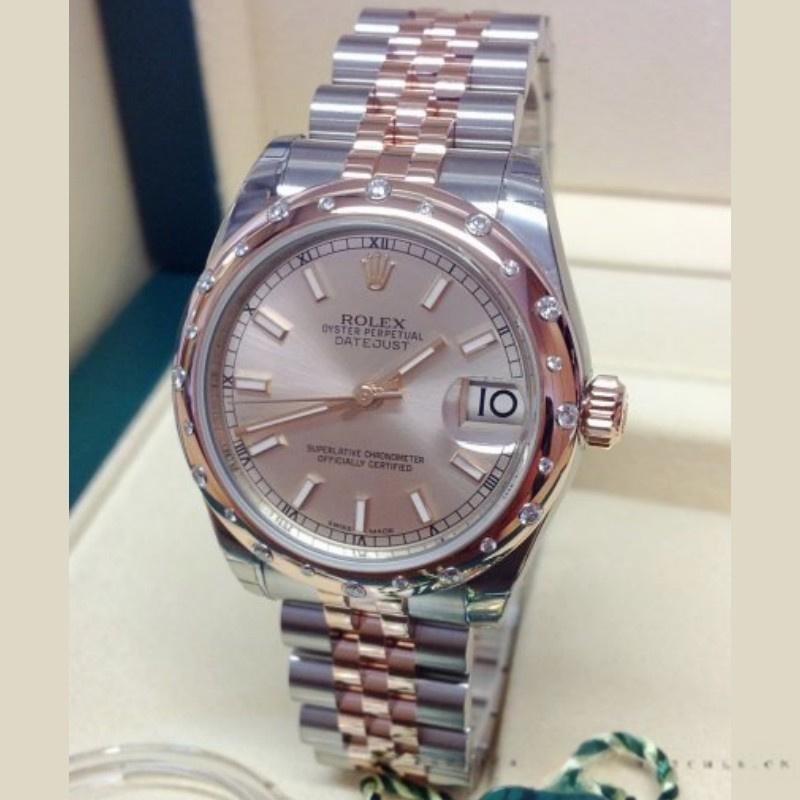 Rolex Datejust 178341 replica watch for women, pink dial with cane dial, 31 mm. 31mm Rolesor Everose case in Oystersteel steel and Everose gold, screwed back and crown with Twinlock double-sealing system, Everose gold domed bezel with 24 diamonds set, scratch-resistant sapphire crystal with Cyclops lens on the date. Pink dial with cane dial and date window at 3 o’clock. Two-tone stainless steel and rose gold bracelet with folding clasp.