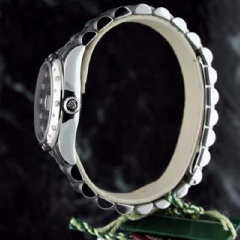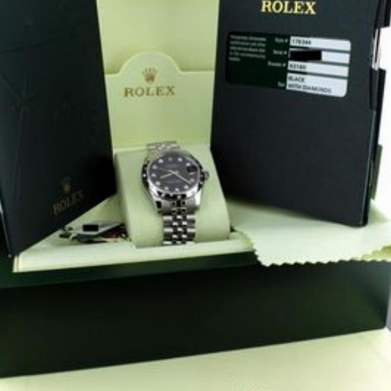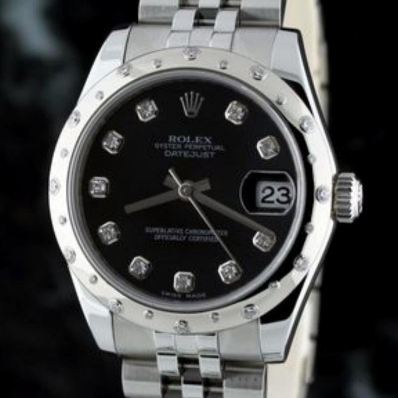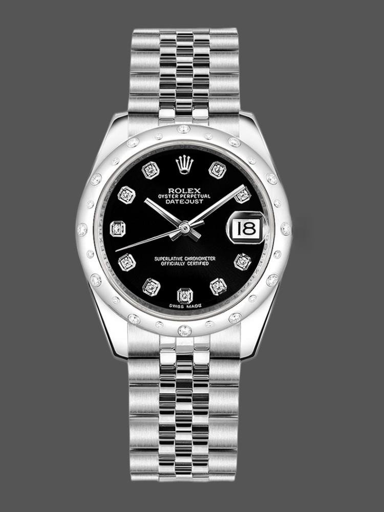 Rolex Datejust 178344 replica watch for women with black dial and diamonds, 31 mm Jubilee bracelet. 31mm stainless steel case, black diamond-set dial, white gold bezel set with 24 scattered diamonds, scratch-resistant sapphire crystal with Cyclops lens over date, date at 3 o’clock, Oystersteel Jubilee bracelet with five links and hidden Crownclasp folding clasp.