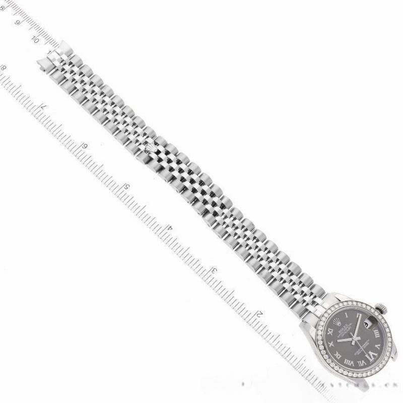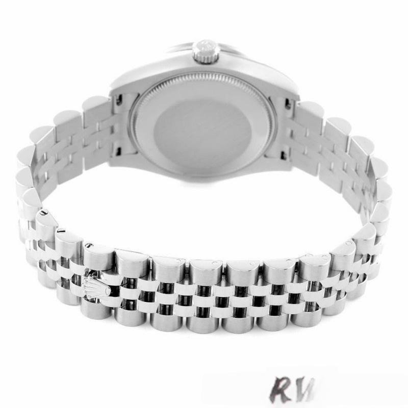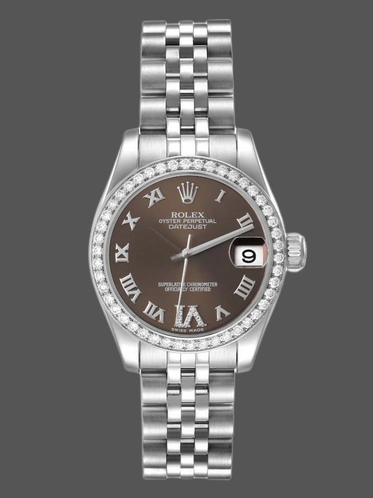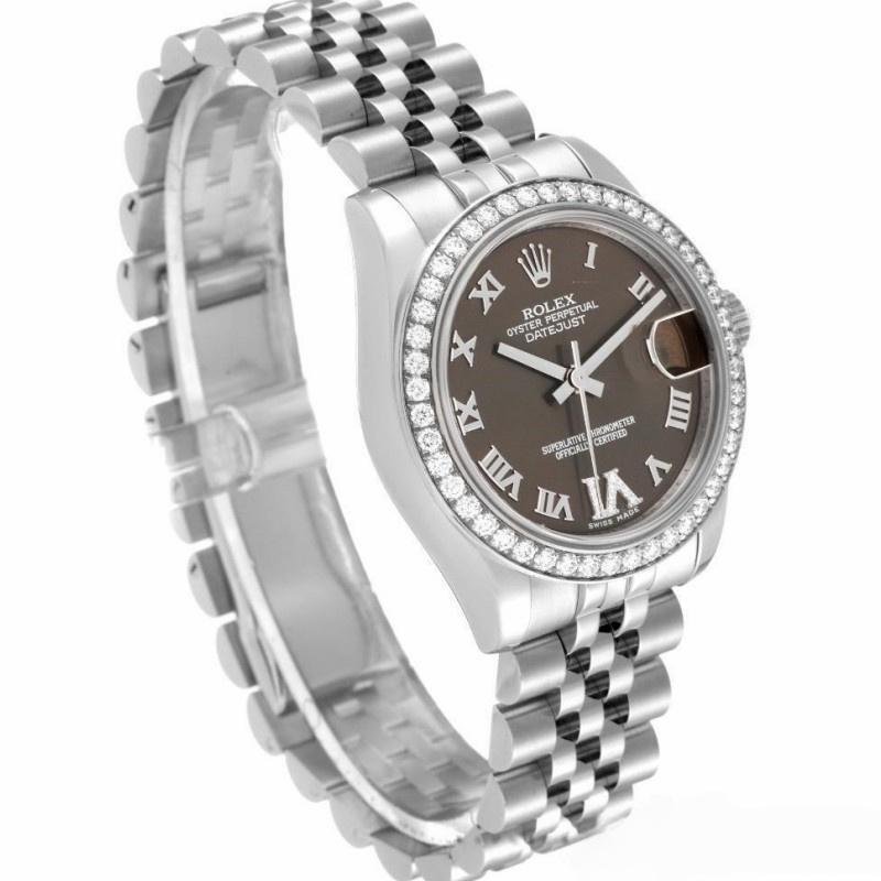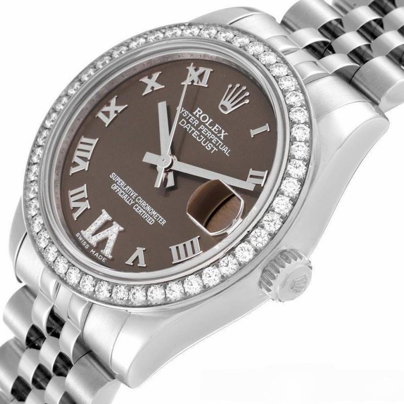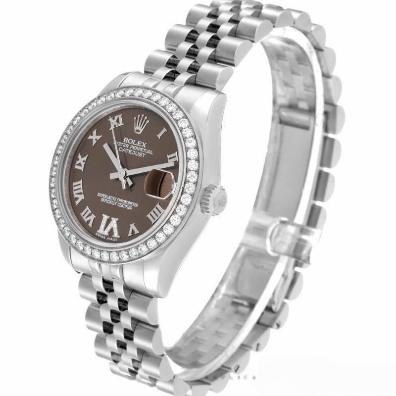 Rolex Datejust 178384 replica watch for women, stainless steel, brown diamond dial, 31 mm. 31mm diameter stainless steel Oyster case. Features diamond-set bezel, scratch-resistant sapphire crystal with Cyclops magnifying glass. Brown dial with Roman numerals. Diamond VI in Roman numerals at 6 a.m. Calendar with window at 3 a.m. Jubilee stainless steel bracelet with folding clasp.