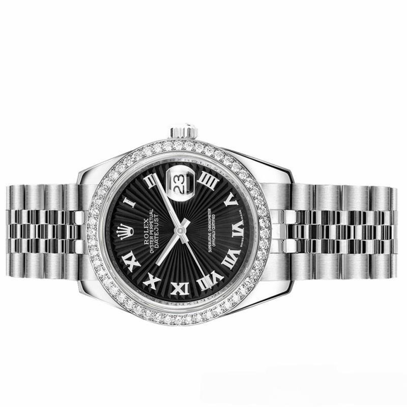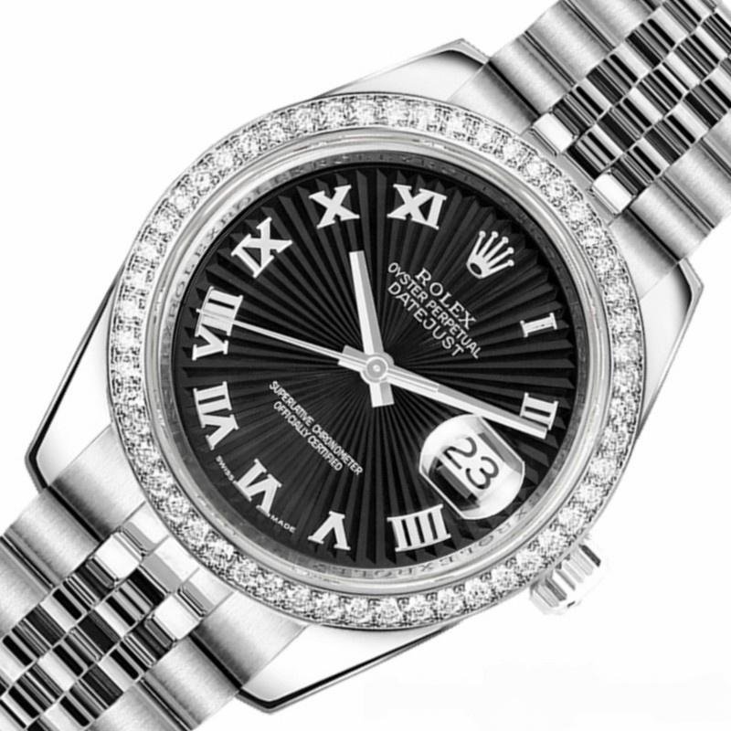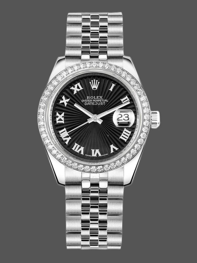Rolex Datejust 178384 women’s watch, stainless steel replica, black dial with sunray effect, 31 mm. 31mm round white gold case with screw-down crown and white gold bezel set with diamonds. Black dial with sunray effect, silver hands and hour markers in Roman numerals. Calendar with window at 3. Jubilee stainless steel bracelet with folding clasp.