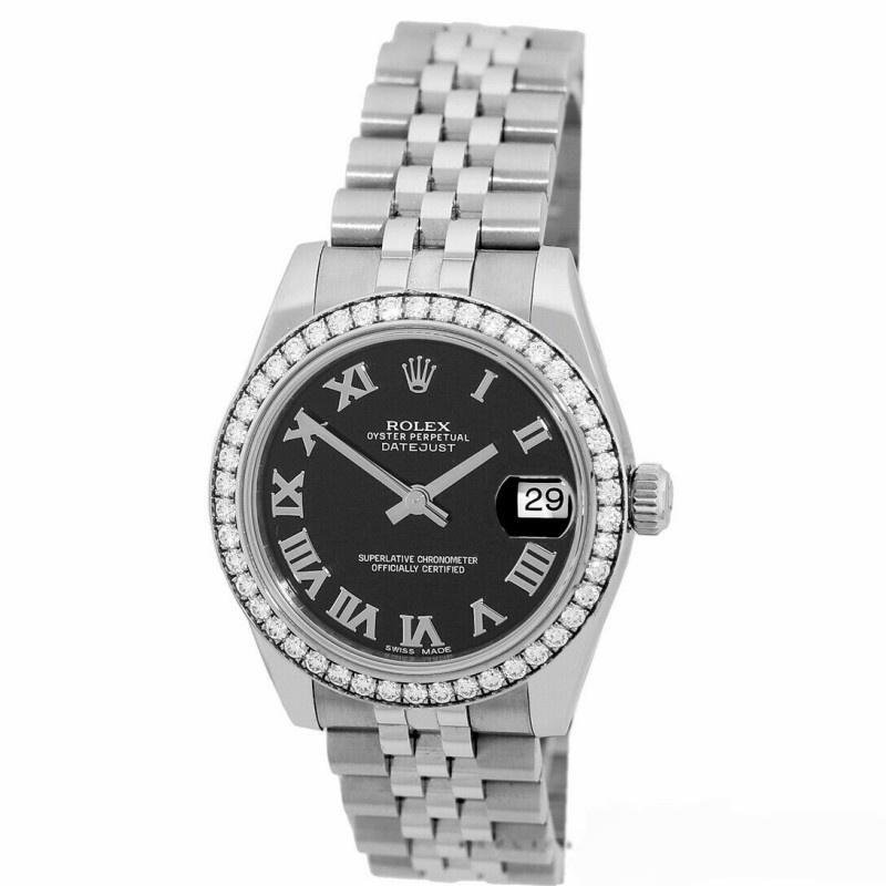 Rolex Datejust 178384 replica women’s stainless steel watch, black Roman dial, 31 mm. 31mm round white gold case with screw-down crown, white gold bezel with diamonds set. Black dial with Roman markers. Calendar with window at 3. Jubilee stainless steel bracelet with folding clasp.