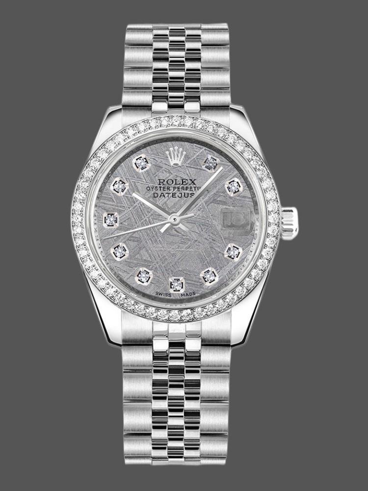 Rolex Datejust 178384 replica watch for women, meteorite gray dial, diamond bezel, 31 mm. 31 mm diameter stainless steel Oyster case. White gold diamond bezel. Scratch resistant sapphire crystal with Cyclops magnifying glass. Meteorite gray dial with diamond indexes. Calendar with date on the window at 3. Jubilee stainless steel bracelet with hidden closure.