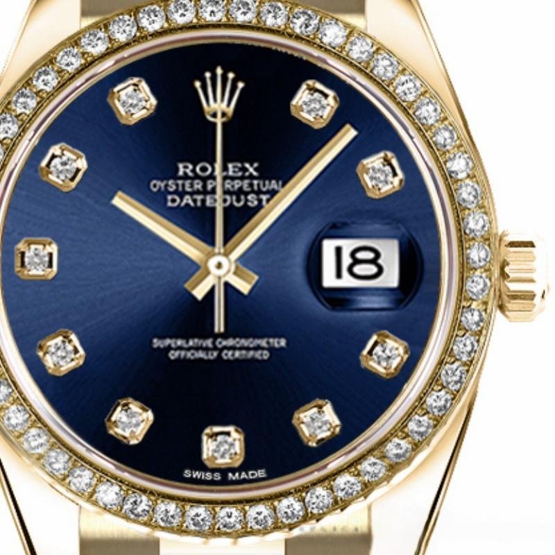 Rolex Datejust 179138 replica watch for women with 26 mm blue diamond dial and 26 mm diameter yellow gold Oyster case. Yellow gold diamond bezel. Scratch resistant sapphire crystal with Cyclops magnifying glass. Blue dial with diamond hour markers. Calendar with window at 3. Yellow gold President bracelet with hidden clasp.