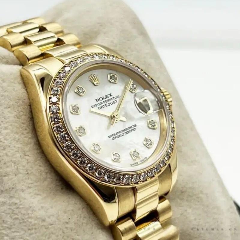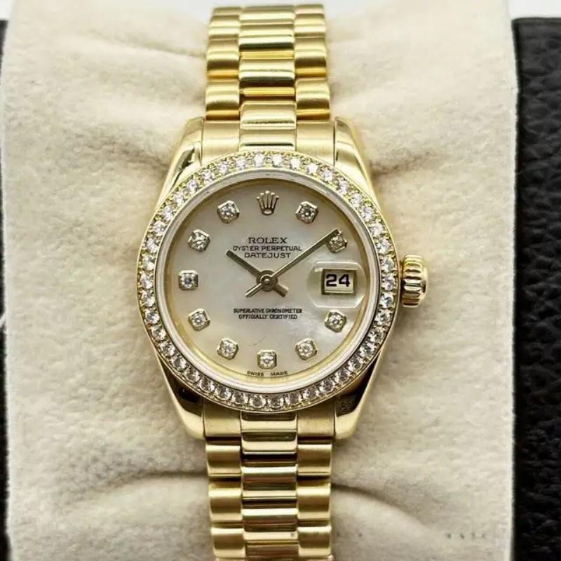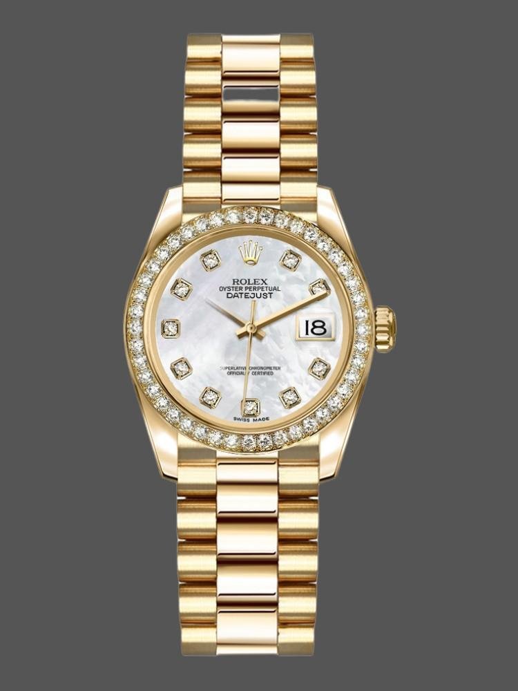 Rolex Datejust 179138 replica watch for women with mother-of-pearl dial and 26 mm diamonds, 26 mm diameter yellow gold Oyster case. Yellow gold diamond bezel. Scratch resistant sapphire crystal with Cyclops magnifying glass. Mother-of-pearl dial with diamond hour markers. Calendar with window at 3. Yellow gold President bracelet with hidden clasp.