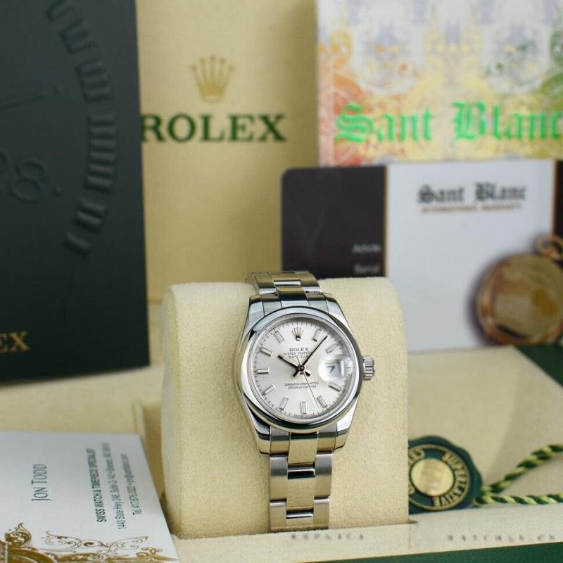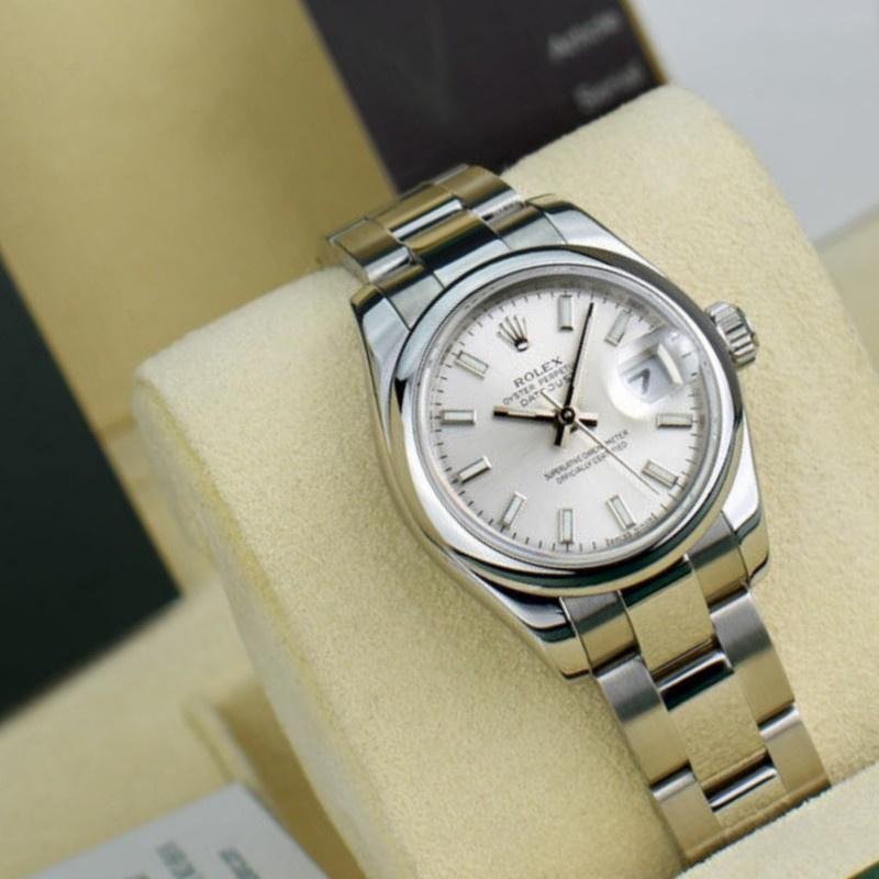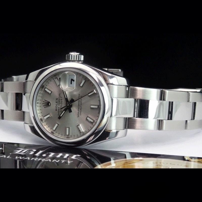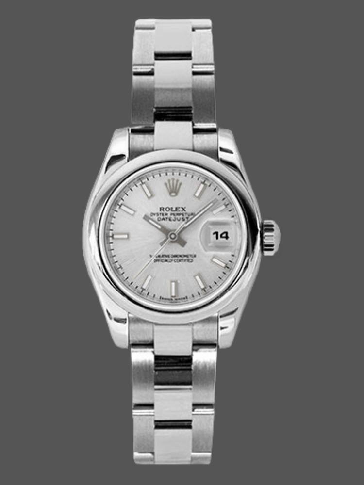 Rolex Datejust 179160 replica watch for women, domed bezel, silver dial with indexes, 26 mm. 26 mm diameter stainless steel case. Screw-down crown. Scratch resistant sapphire crystal. Silver dial with hourly indexes. Calendar window at 3. A smooth bezel and polished stainless steel Oyster bracelet enhance the modern style of this women’s watch, while offering a comfortable, durable fit.