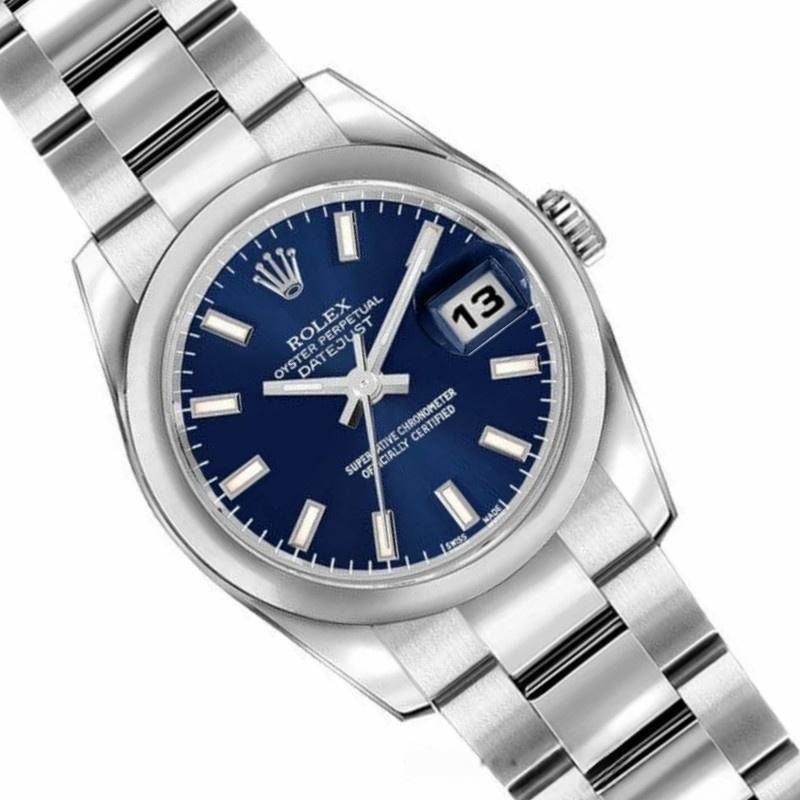 Rolex Datejust 179160 replica watch for women, blue dial with indexes and domed bezel, 26 mm. 26 mm diameter stainless steel case. Screw-down crown. Scratch resistant sapphire crystal. Blue dial with hourly indexes. Calendar window at 3. A smooth bezel and sleek stainless steel Oyster bracelet with flat links enhance the modern style of this women’s watch, while offering a comfortable, wrist-resistant fit.