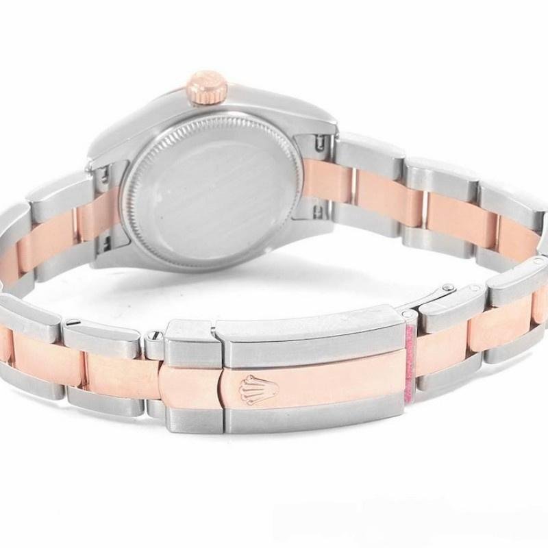 Rolex Datejust 179161 replica watch for women, stainless steel and Everose gold, pink dial with indexes, 26 mm. 26mm polished stainless steel case and smooth rose gold bezel. Rose gold Twinlock crown, pink dial with index hour markers. Date window with cyclops magnifying lens at 3 o’clock. Polished stainless steel and rose gold Oyster style bracelet with folding Oyster clasp.