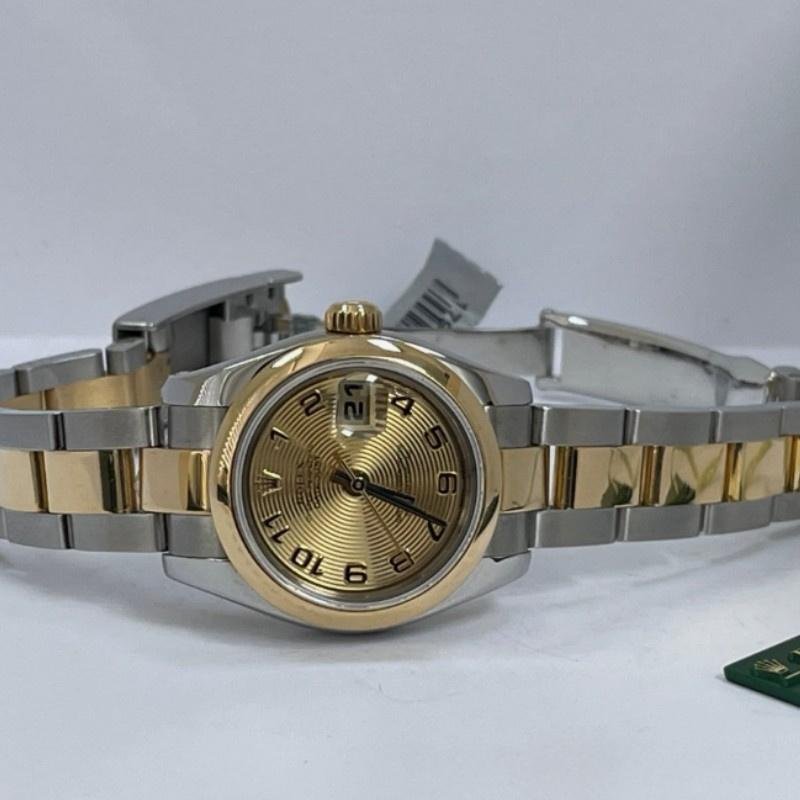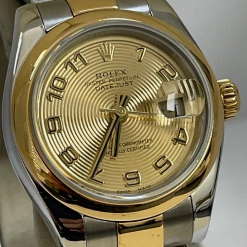 Rolex Datejust 179163 replica watch for women, with champagne dial and concentric circles, domed bezel, 26 mm. 26mm yellow gold stainless steel case domed bezel. Champagne-colored dial with concentric circles and hour markers in Arabic numerals. Date at 3. Scratch resistant sapphire crystal. Screw-down crown. The reliable yellow gold and stainless steel Oyster bracelet will look perfect on your wrist.