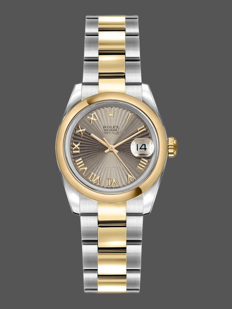 Rolex Datejust 179163 replica watch for women, Sunbeam gray dial, domed bezel, 26 mm. 26mm yellow gold stainless steel case, domed bezel. Sunbeam gray dial with Roman numeral hour markers. Date display at 3. Scratch resistant sapphire crystal. Screw-down crown. The reliable yellow gold and stainless steel Oyster bracelet will look perfect on your wrist.