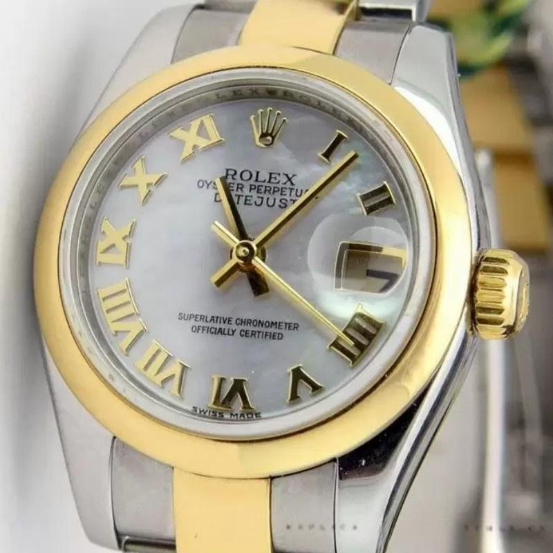 Rolex Datejust 179163 replica watch for women with Roman dial and mother-of-pearl, 26 mm. 26mm yellow gold stainless steel case. Vaulted bezel. Mother-of-pearl dial with hour markers in Roman numerals. Date display at 3. Scratch resistant sapphire crystal. Screw-down crown. The reliable yellow gold and stainless steel Oyster bracelet will look perfect on your wrist.
