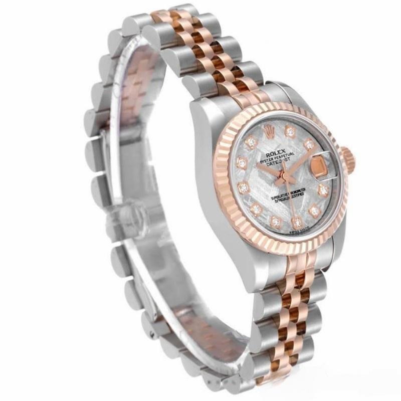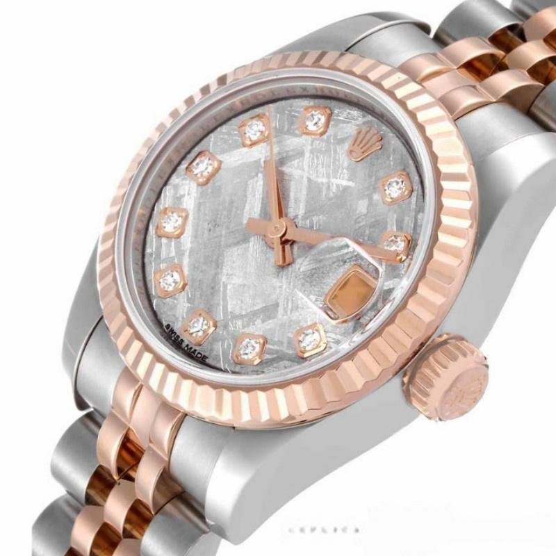 Rolex Datejust 179171 replica watch for women with diamond meteorite dial and 26mm fluted bezel. 26mm stainless steel case with rose gold crown. Rose gold fluted bezel. Meteorite dial with diamond hour markers. Date display window located at the 3 o’clock position. Two-tone rose gold and stainless steel jubilee bracelet.