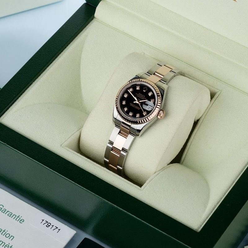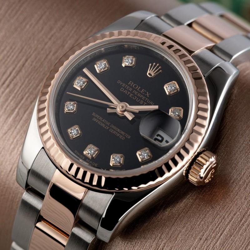 Rolex Datejust 179171, 26 mm replica women’s watch with black dial and diamond striated bezel. 26mm stainless steel case with rose gold crown. Rose gold fluted bezel. Black dial with diamond hour markers. Date window at 3. Two-tone rose gold and stainless steel Jubilee bracelet.