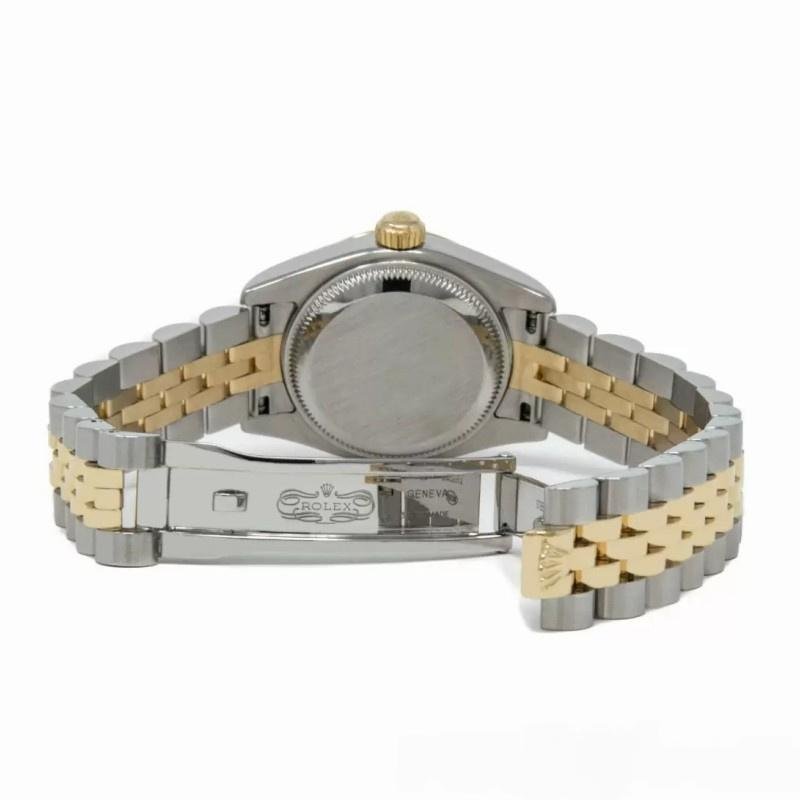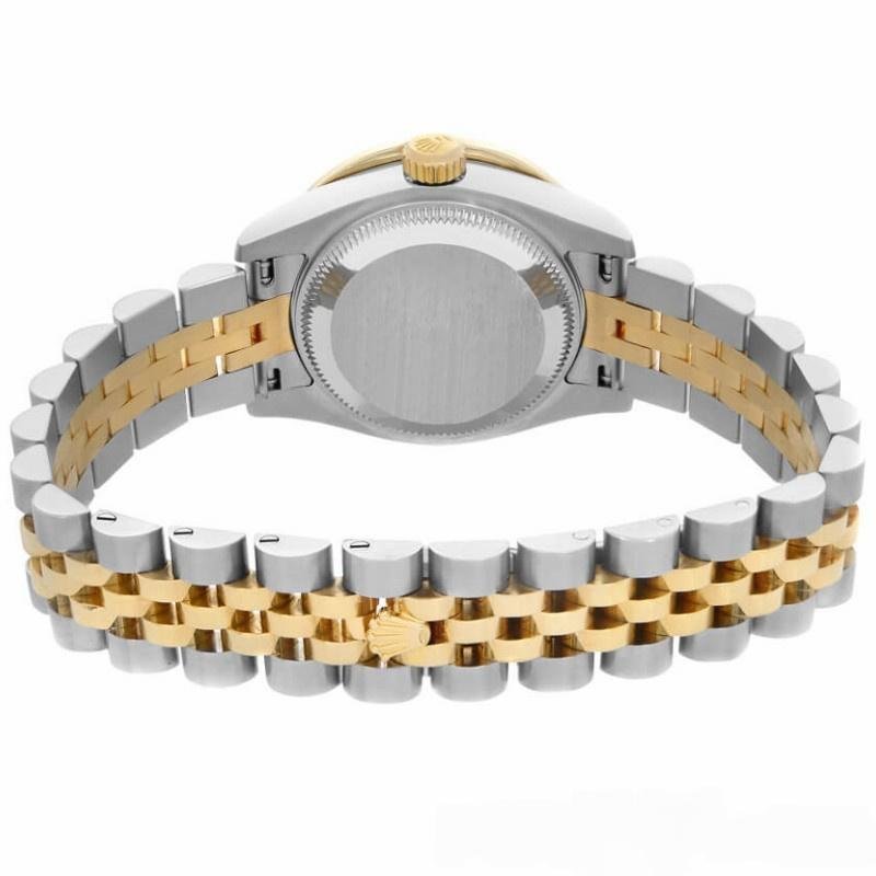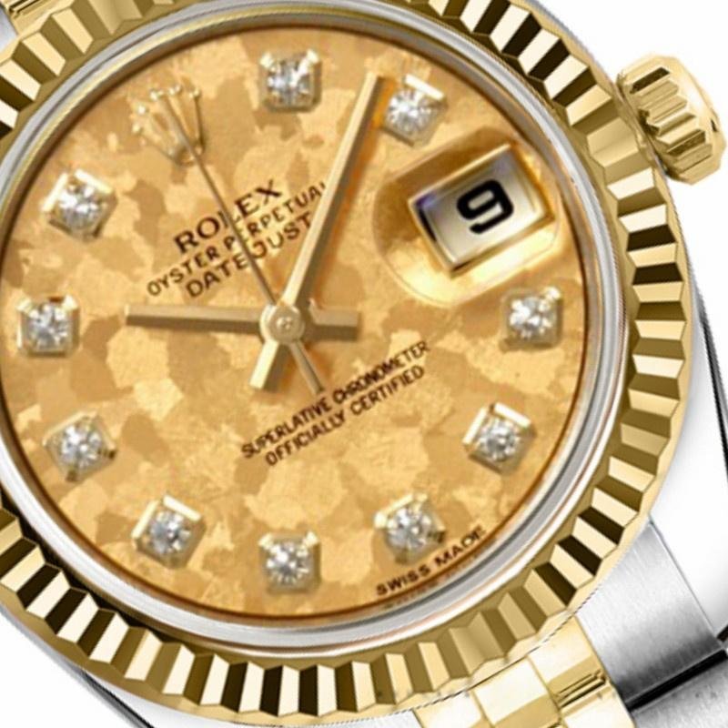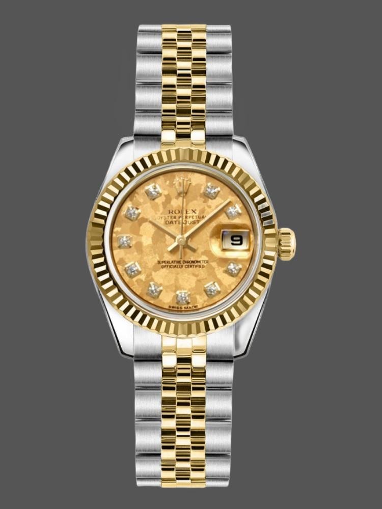 Rolex Datejust 179173 replica watch for women with champagne dial and 26 mm fluted bezel. 26 mm diameter stainless steel Oyster case. Yellow gold fluted bezel. Scratch resistant sapphire crystal with Cyclops magnifying glass. Champagne crystal dial with diamond hour markers. Calendar with window at 3. Jubilee stainless steel and yellow gold bracelet with hidden clasp.