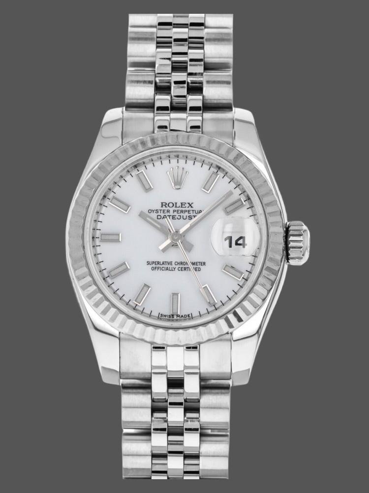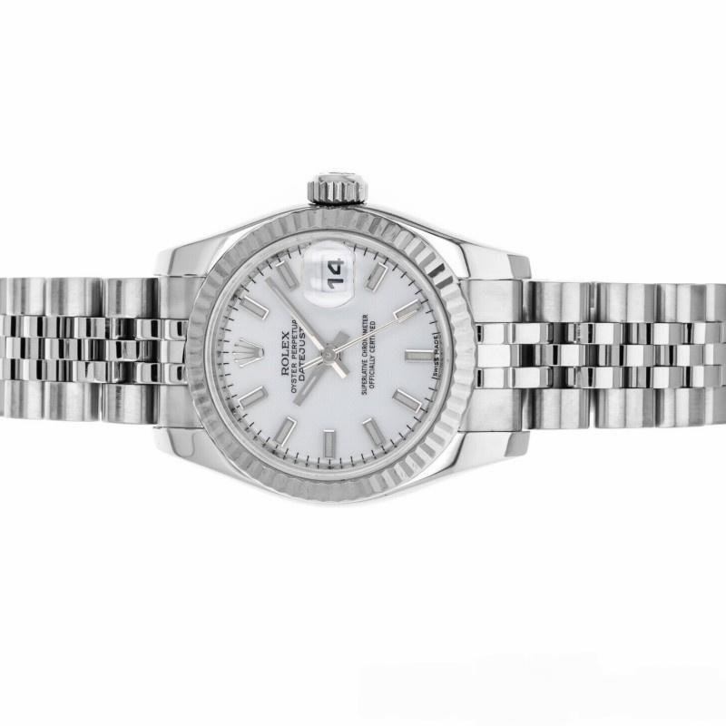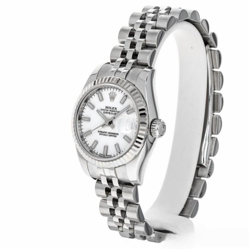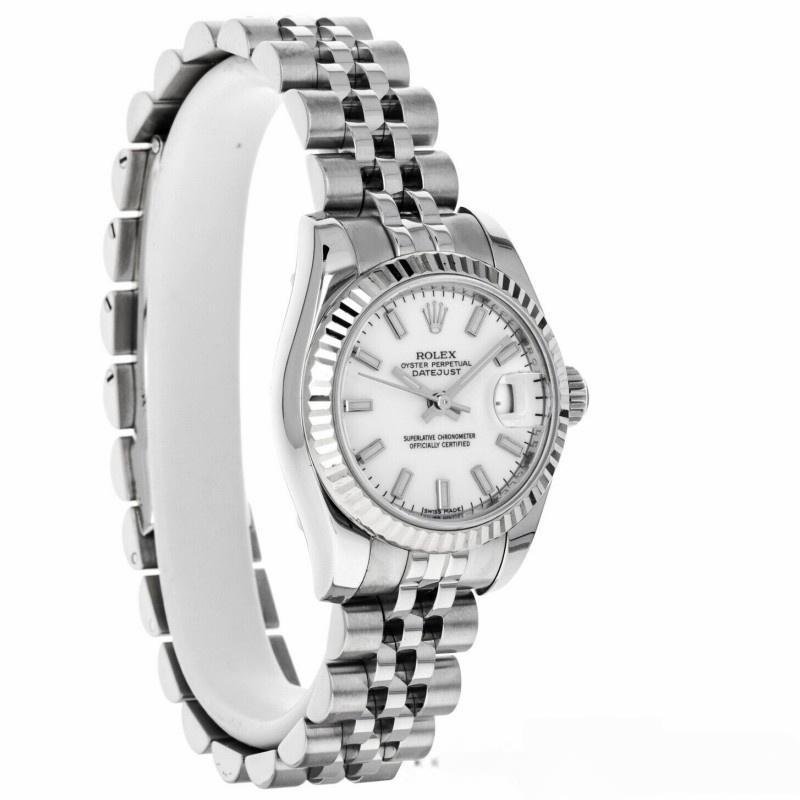 Rolex Datejust 179174 replica watch for women, white dial with indexes and fluted bezel, 26 mm. 26 mm diameter stainless steel Oyster case. White gold fluted bezel. Scratch resistant sapphire crystal with Cyclops magnifying glass. White dial with hourly indexes. Calendar with window at 3. Jubilee stainless steel bracelet with hidden clasp.