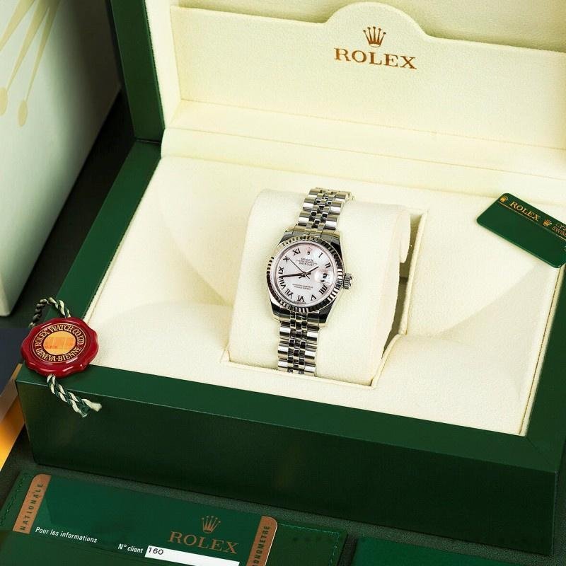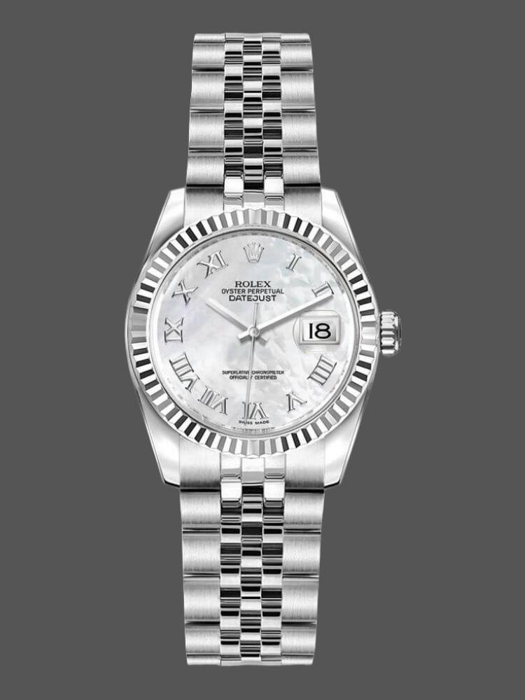 Rolex Datejust 179174 replica watch for women, white dial with mother-of-pearl and fluted bezel, 26 mm. 26 mm diameter stainless steel Oyster case. White gold fluted bezel. Scratch resistant sapphire crystal with Cyclops magnifying glass. Mother-of-pearl white with Roman numeral markers. Calendar with window at 3. Jubilee stainless steel bracelet with hidden clasp.