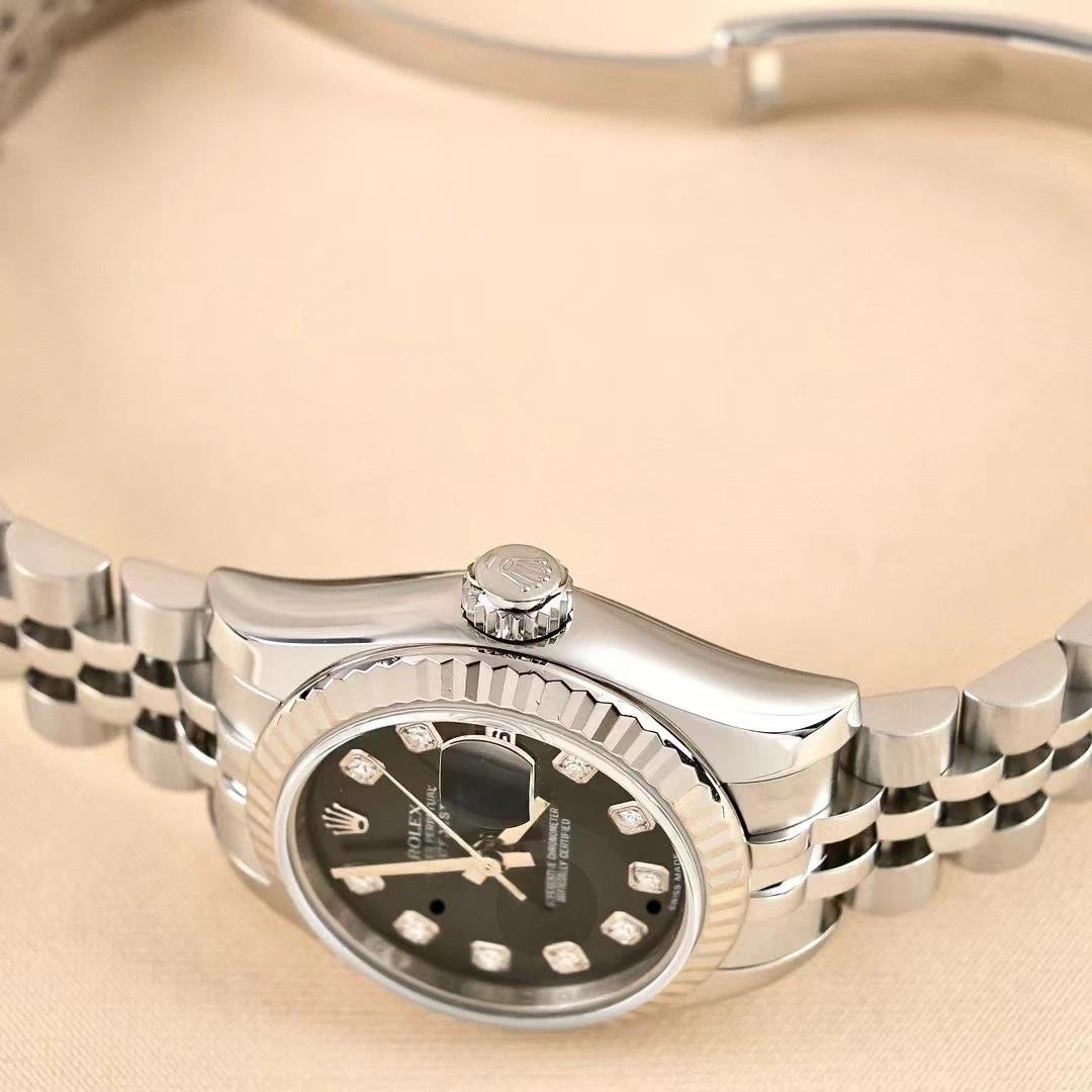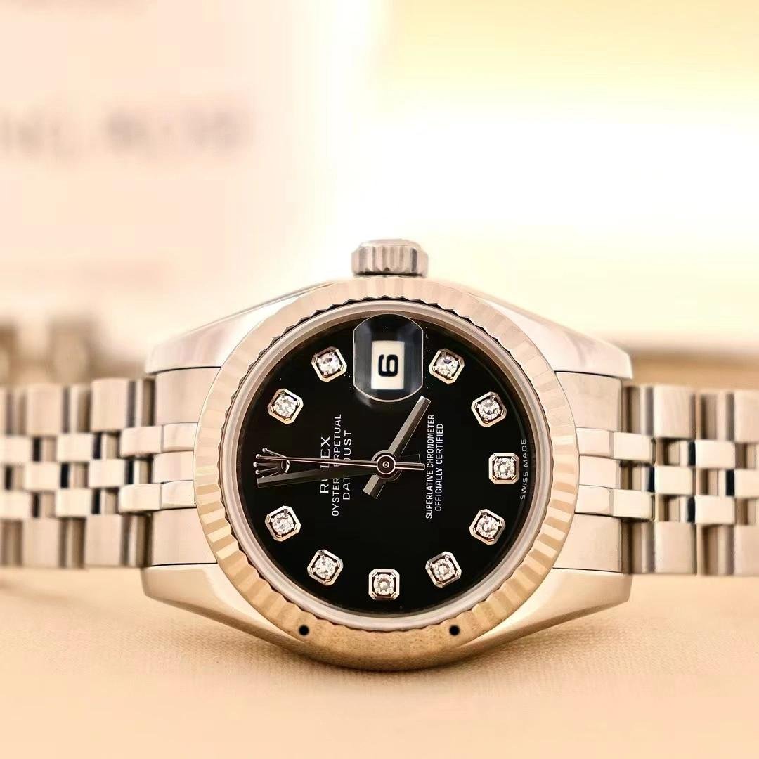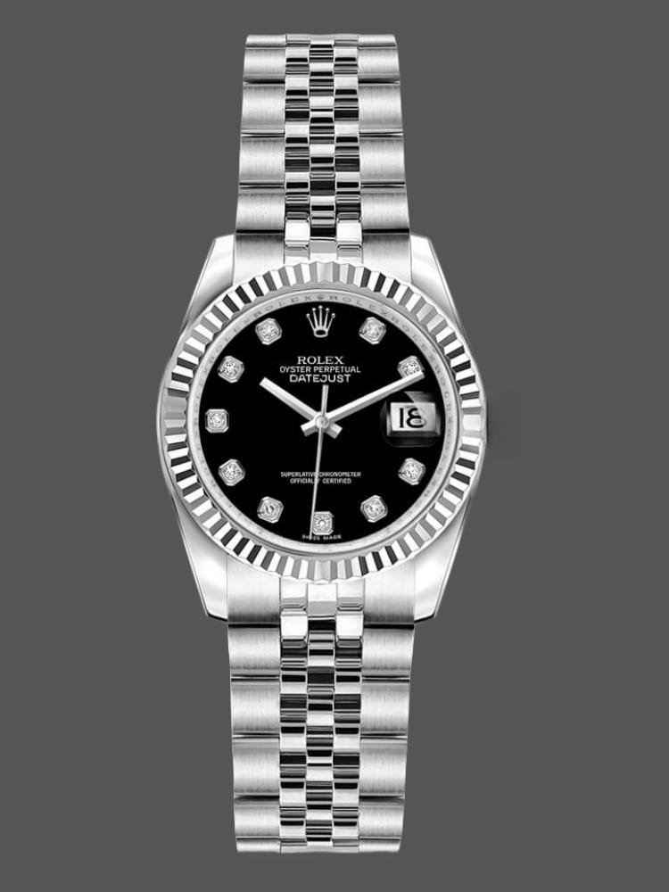 Rolex Datejust 179174 – Women’s replica with black dial and diamond fluted bezel, 26 mm. 26 mm diameter stainless steel Oyster case. White gold fluted bezel. Scratch resistant sapphire crystal with Cyclops magnifying glass. Black dial with diamond hour markers. Calendar with date at the 3 o’clock window. Jubilee stainless steel bracelet with hidden clasp.