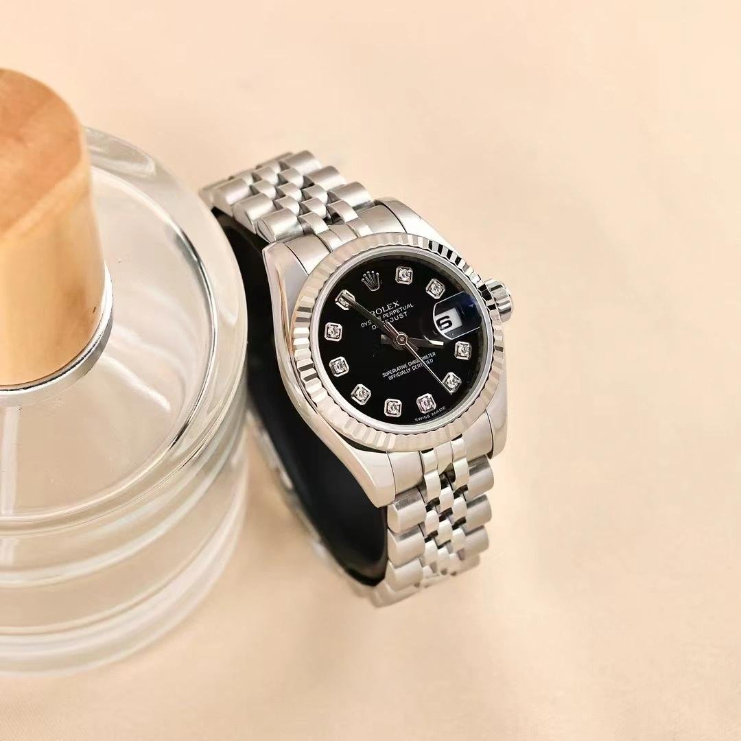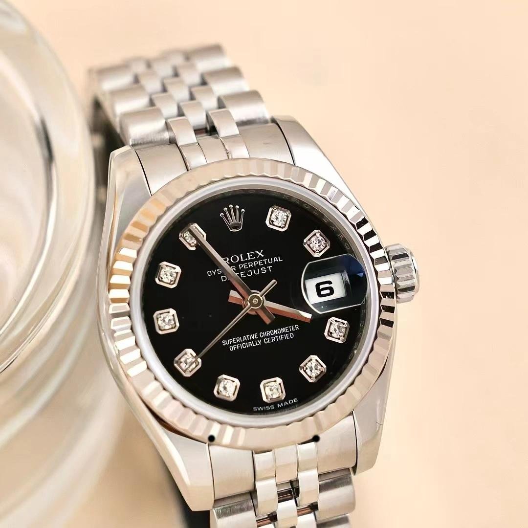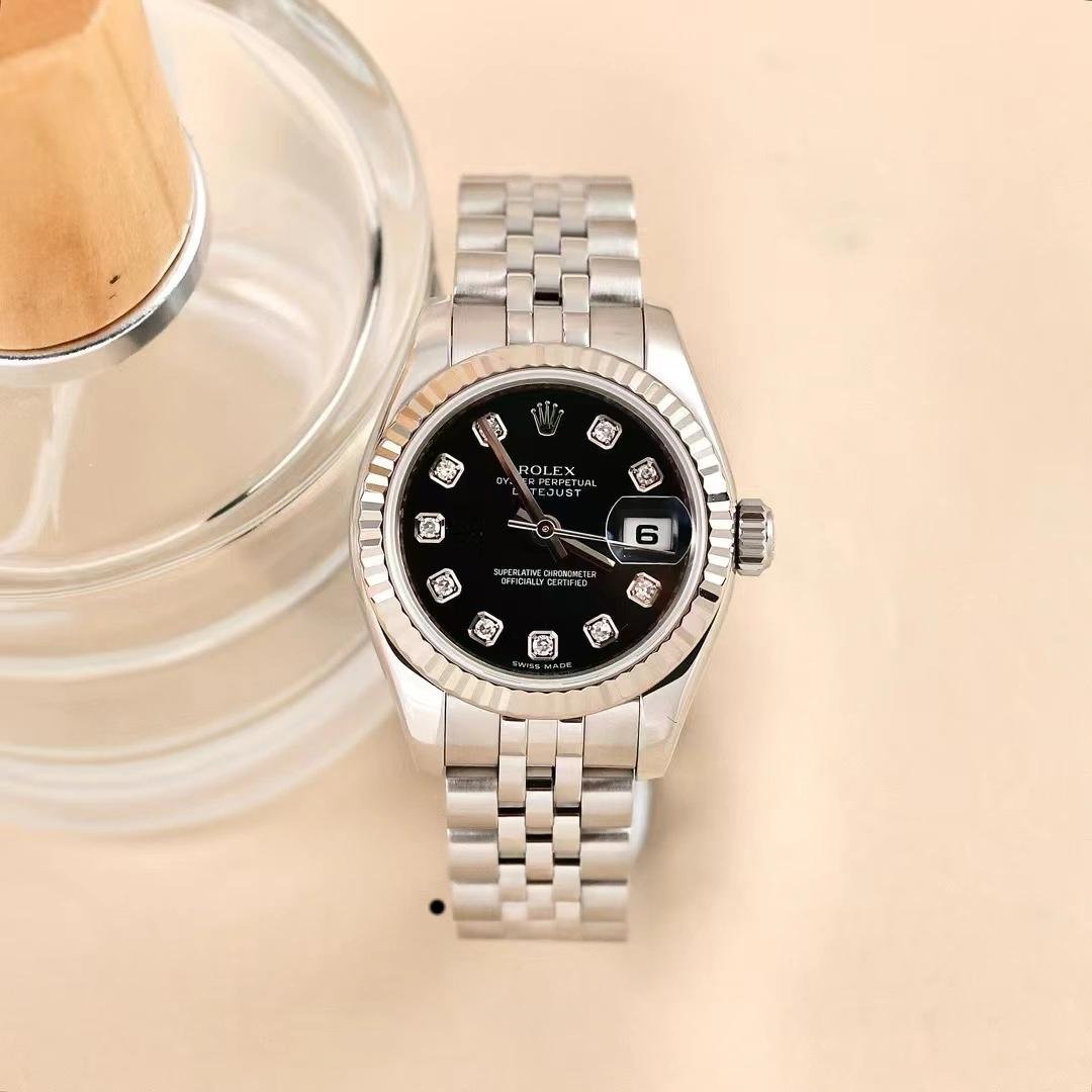 Rolex Datejust 179174 – Women’s replica with black dial and diamond fluted bezel, 26 mm. 26 mm diameter stainless steel Oyster case. White gold fluted bezel. Scratch resistant sapphire crystal with Cyclops magnifying glass. Black dial with diamond hour markers. Calendar with date at the 3 o’clock window. Jubilee stainless steel bracelet with hidden clasp.
