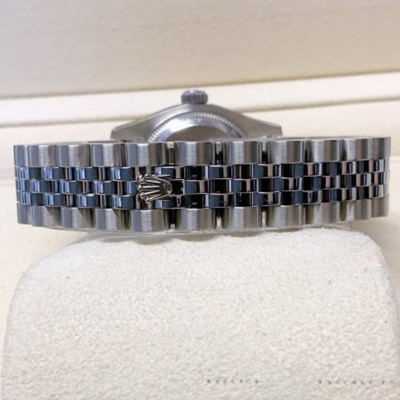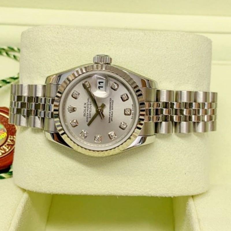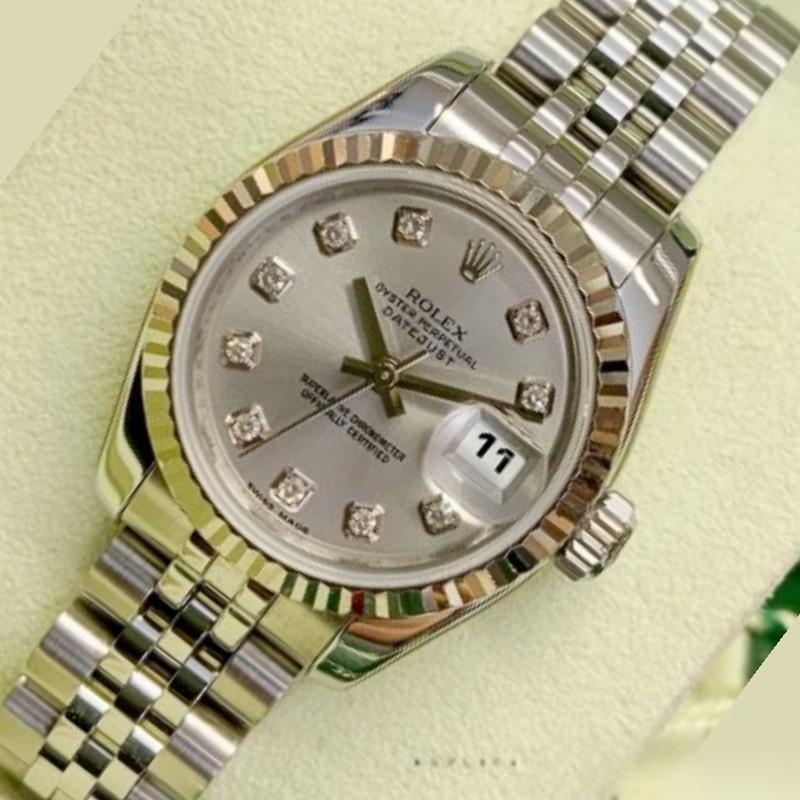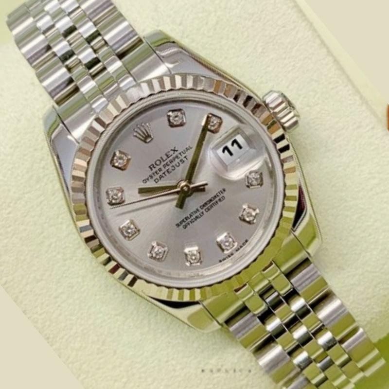 Rolex Datejust 179174 – Women’s replica, silver dial with diamonds and fluted bezel, 26 mm. 26 mm diameter stainless steel Oyster case. White gold fluted bezel. Scratch resistant sapphire crystal with Cyclops magnifying glass. Silver dial with diamond hour markers. Calendar with date at the 3 o’clock window. Jubilee stainless steel bracelet with hidden clasp.