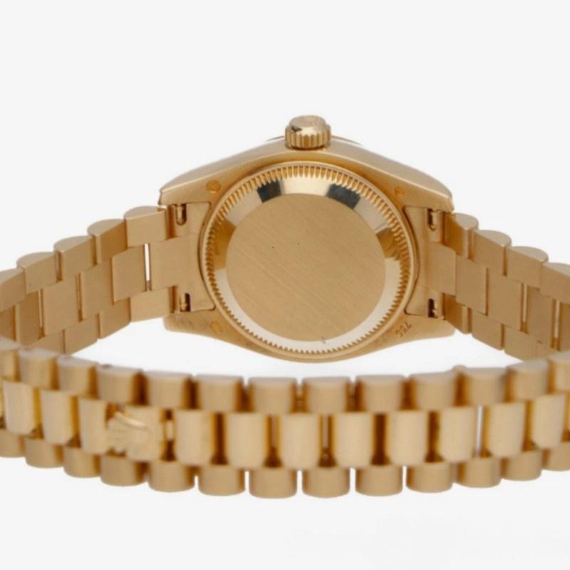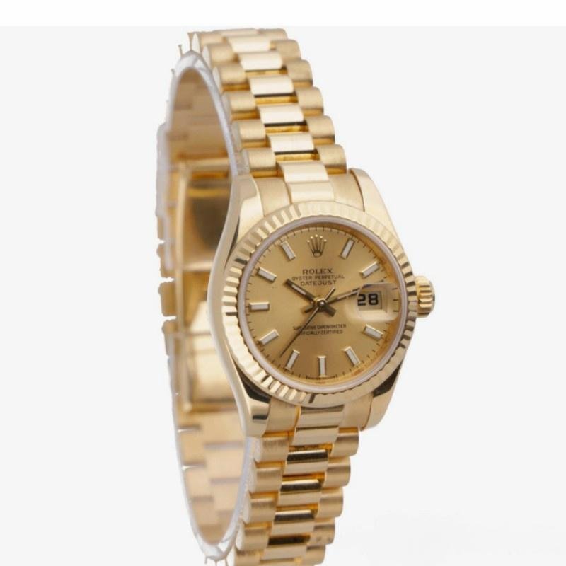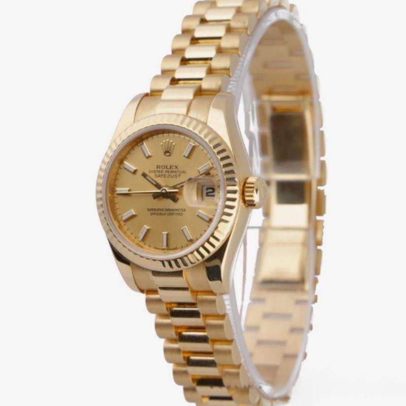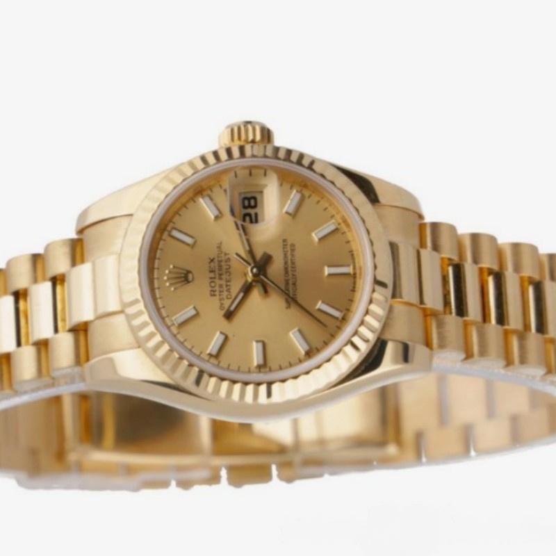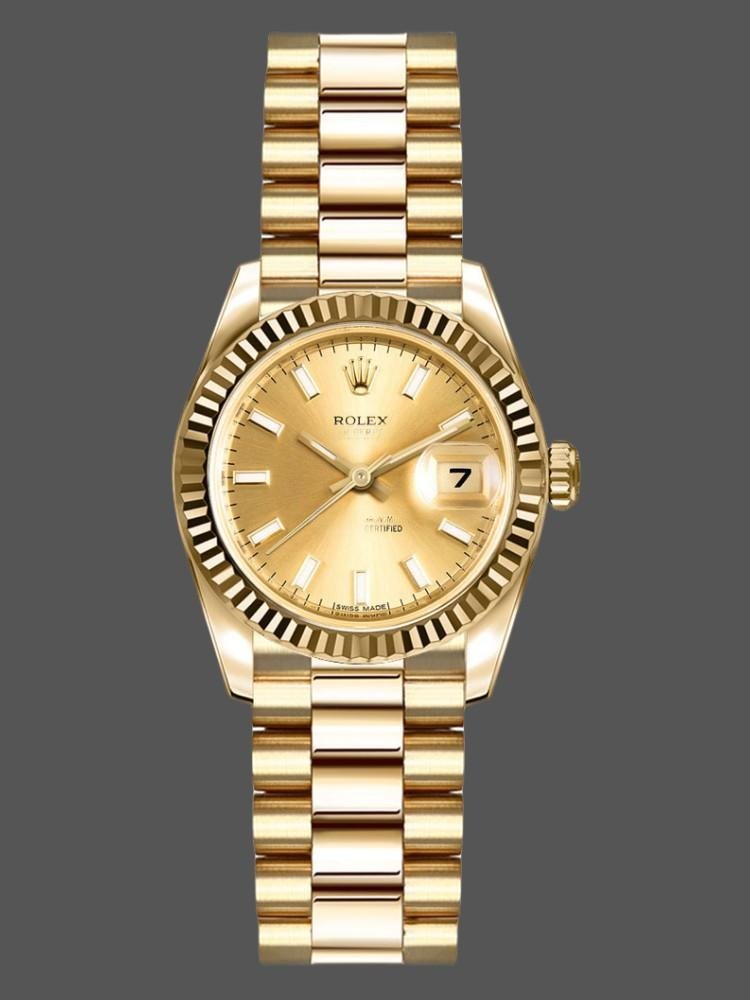 Rolex Datejust 179178 replica watch for women, champagne index dial, yellow gold, 26 mm. 26 mm diameter yellow gold Oyster case. Yellow gold fluted bezel. Scratch resistant sapphire crystal with Cyclops magnifying glass. Champagne color with hourly indices. Calendar with window at 3. Yellow gold President bracelet with hidden clasp.