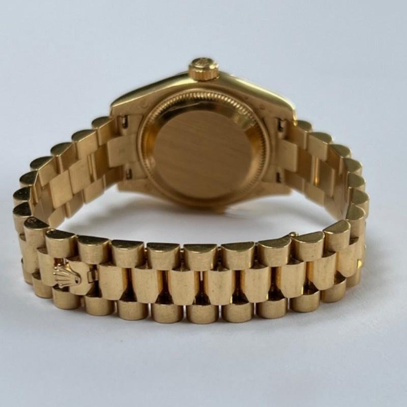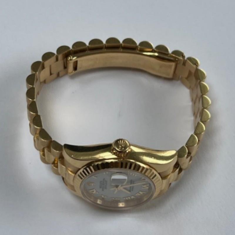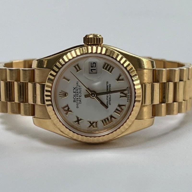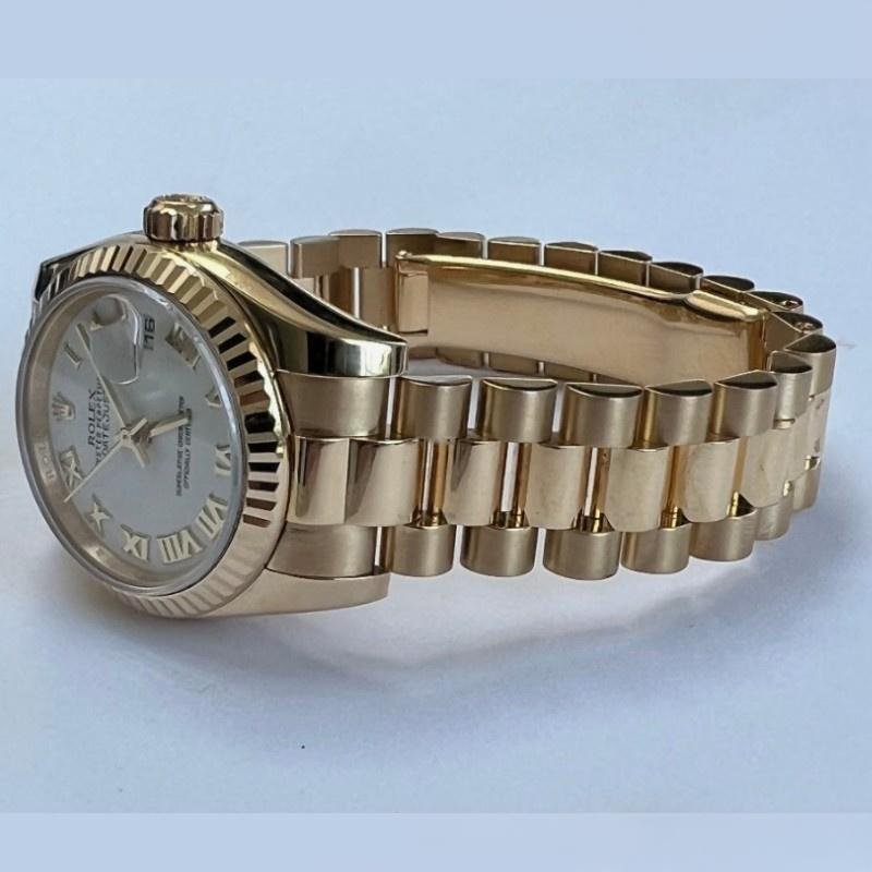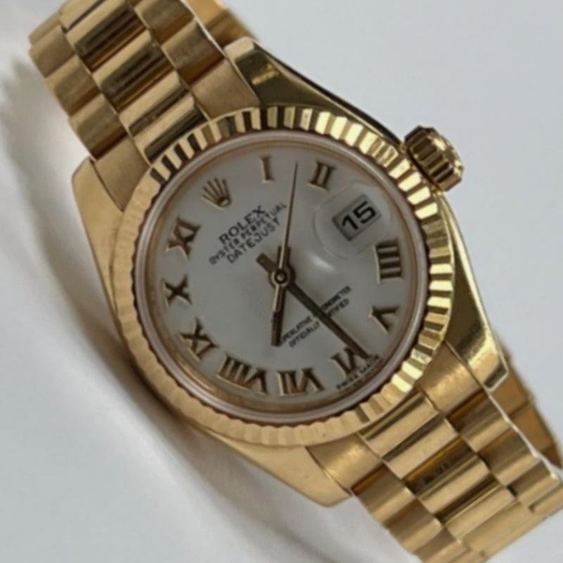 Rolex Datejust 179178, white Roman dial, yellow gold, 26 mm, replica for women. 26 mm diameter yellow gold Oyster case. Yellow gold fluted bezel. Scratch resistant sapphire crystal with Cyclops magnifying glass. White dial with embossed gold Roman numerals. Calendar with window at 3. Yellow gold President bracelet with hidden clasp.