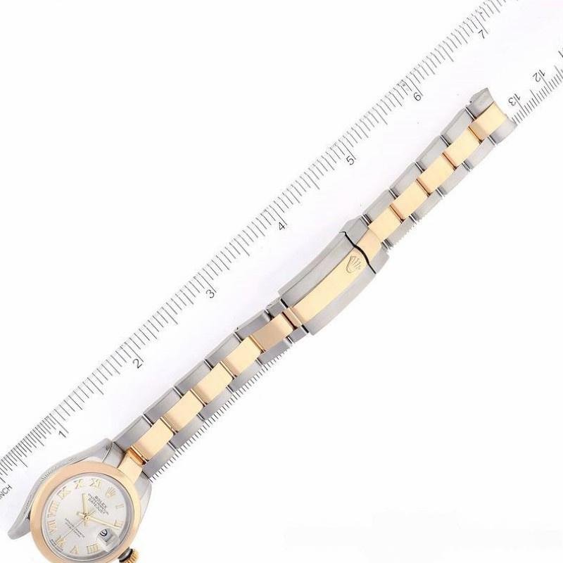 Rolex Datejust 279163 women’s watch, silver Roman dial, domed bezel, 28 mm, 28mm stainless steel Oyster case and smooth yellow gold domed bezel. Scratch resistant sapphire crystal with Cyclops magnifying glass. Silver dial with Roman numeral time markers and date window at 3 o’clock. Oyster bracelet in stainless steel and yellow gold with folding clasp.