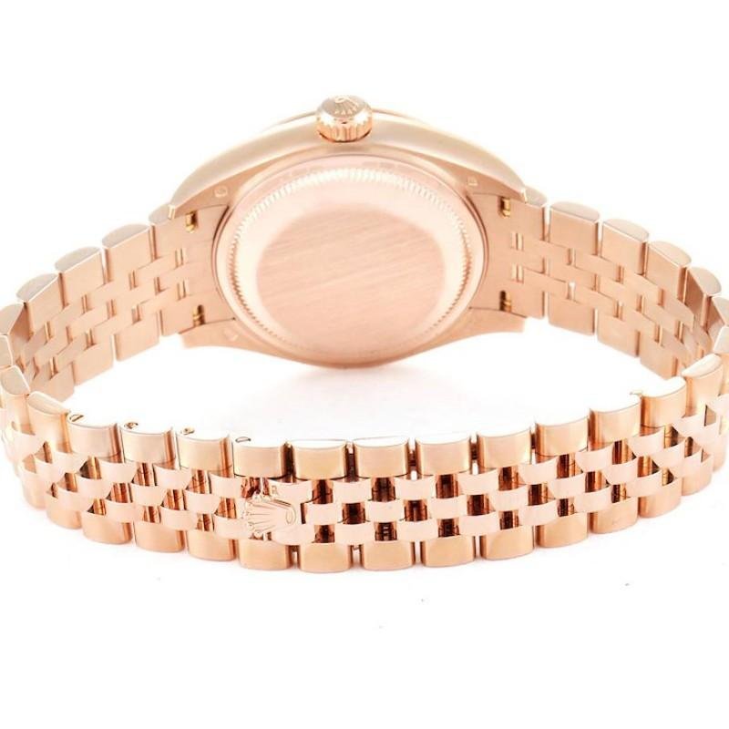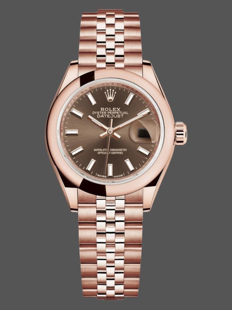 Rolex Datejust 279165 women’s watch, replica, chocolate brown dial, domed bezel, 28 mm, featuring a 28mm Everose gold case and a smooth domed Everose gold bi-directional rotating bezel. Scratch resistant sapphire crystal with Cyclops magnifying glass. Chocolate brown dial with hour indices, luminescent hands and date at 3 o’clock. Rose gold presidential bracelet with hidden clasp.