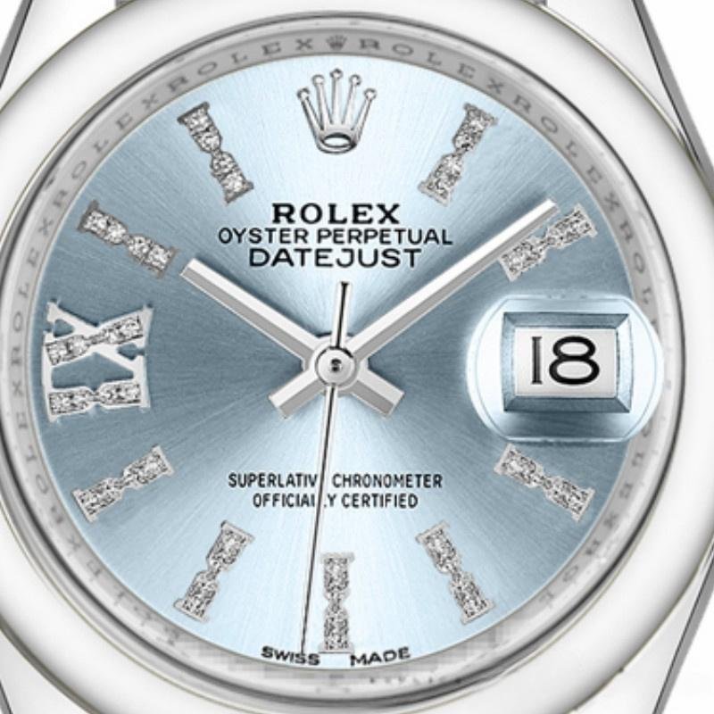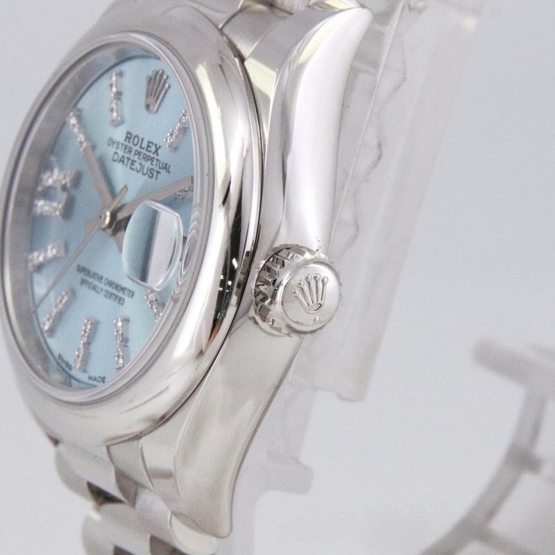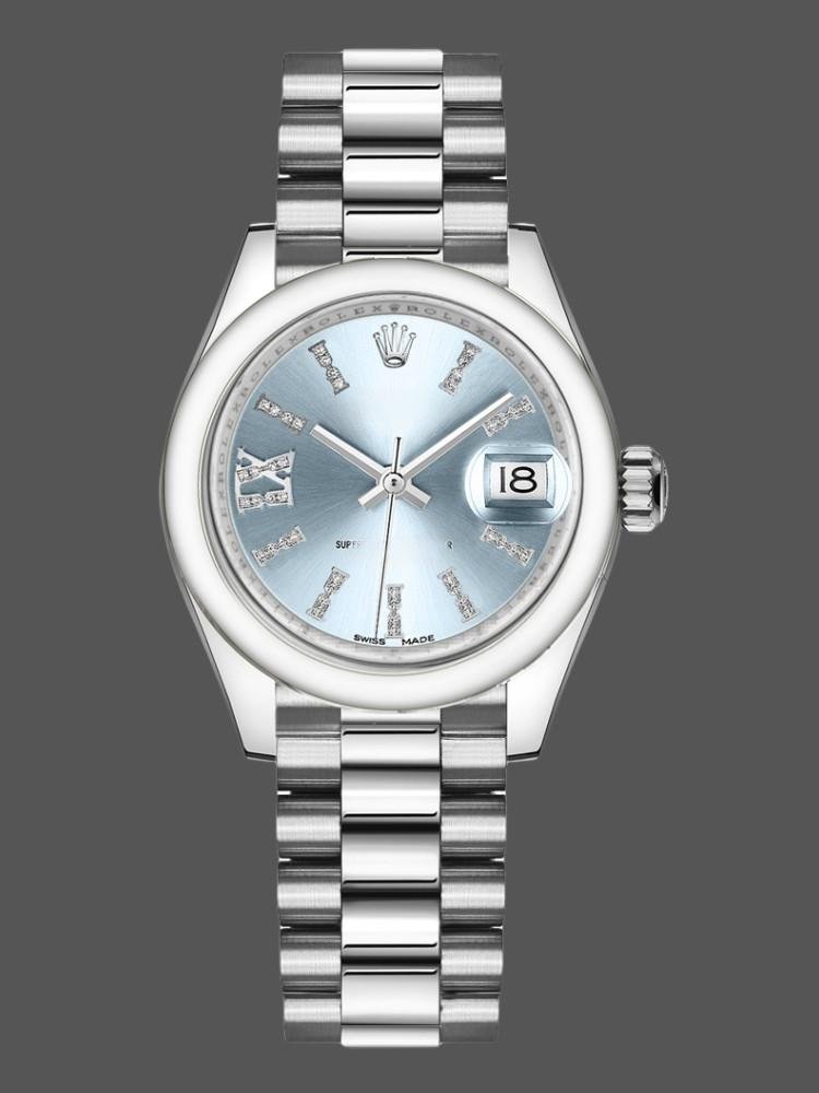 Rolex Datejust 279166 Women’s Watch, Ice Blue Dial, Diamond Vaulted Bezel, 28mm. 28mm polished platinum case and polished platinum domed fixed bezel. Scratch resistant sapphire crystal with Cyclops magnifying glass. Ice blue dial with diamond hour markers and Roman numeral IX. Calendar with window at 3. Polished platinum President bracelet with Crownclasp folding buckle.