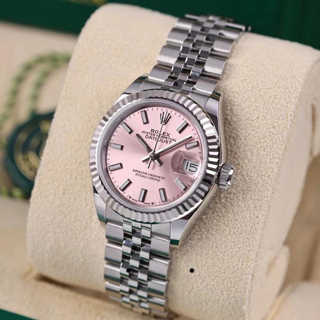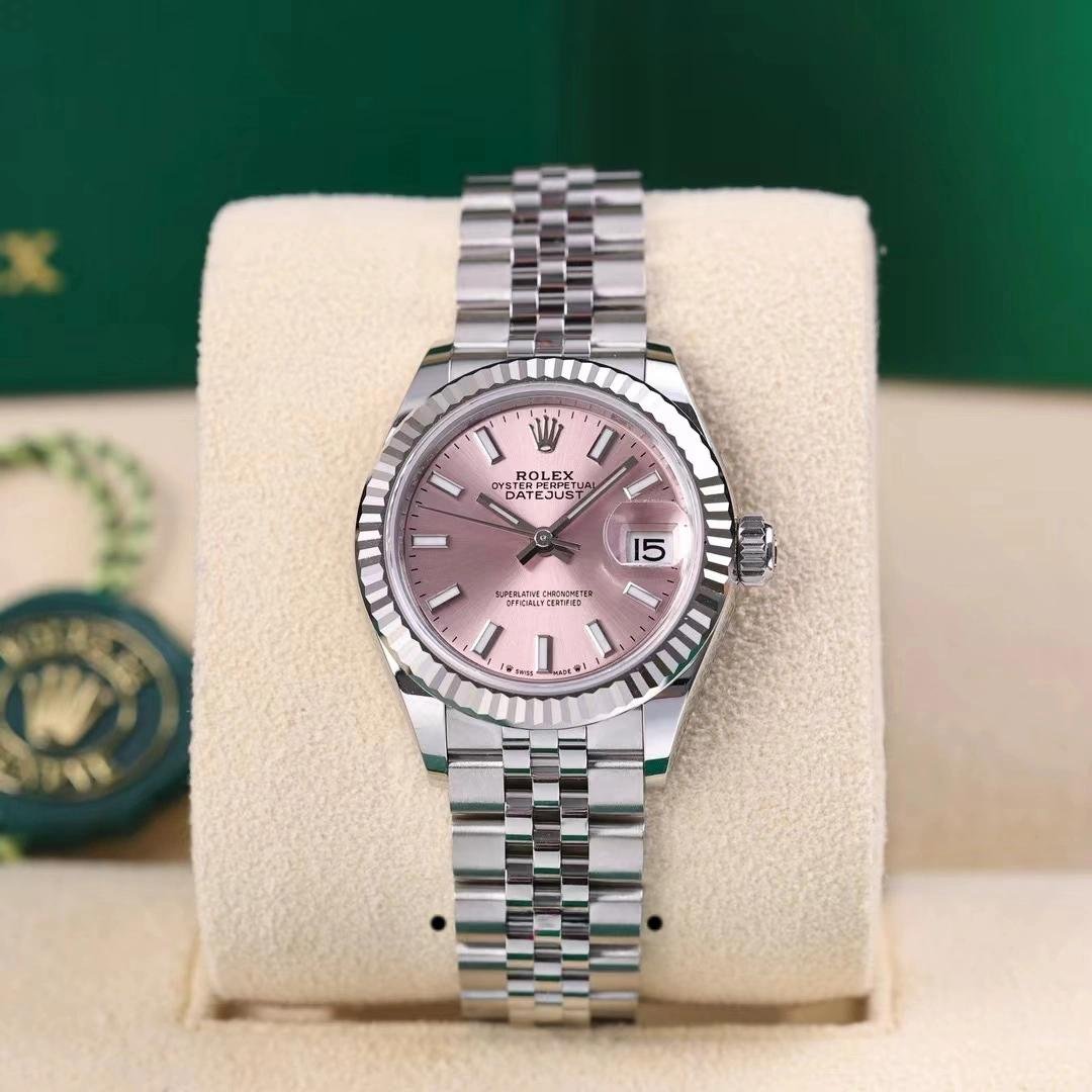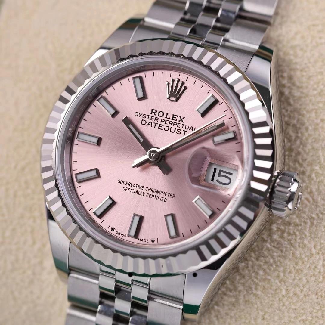 Rolex Datejust 279174, replica for women in stainless steel with pink dial and indexes, 28 mm. 28mm Oystersteel case, polished solid white gold fluted bezel. Screw-down crown with double Twinlock closure. Scratch resistant sapphire crystal with Cyclops magnifying glass. Pink dial with indexes. Calendar at 3. Oystersteel Jubilee stainless steel bracelet with hidden closure. It will look great on your wrist.