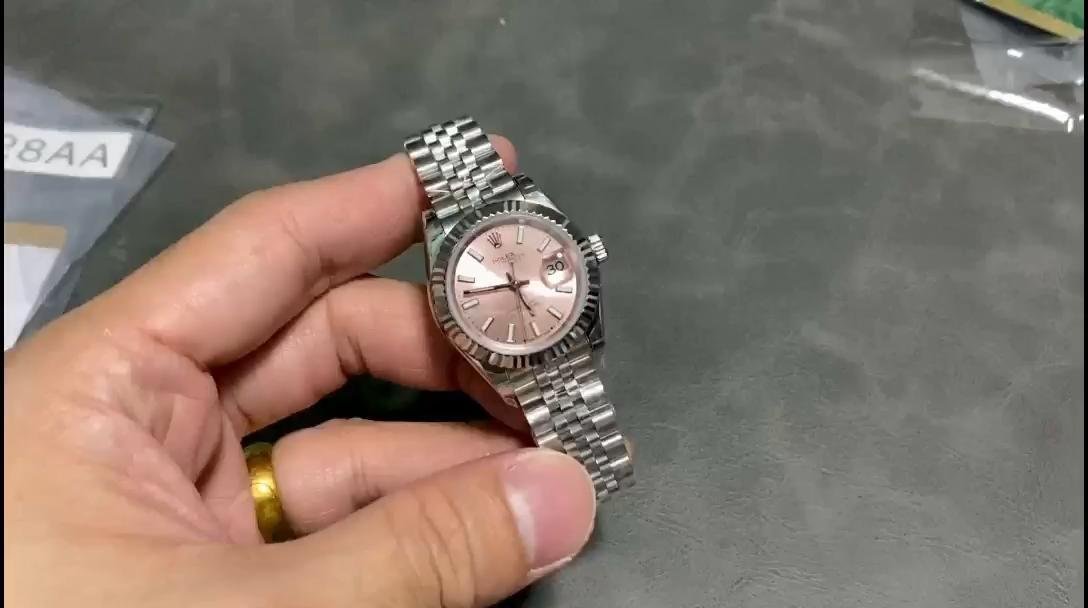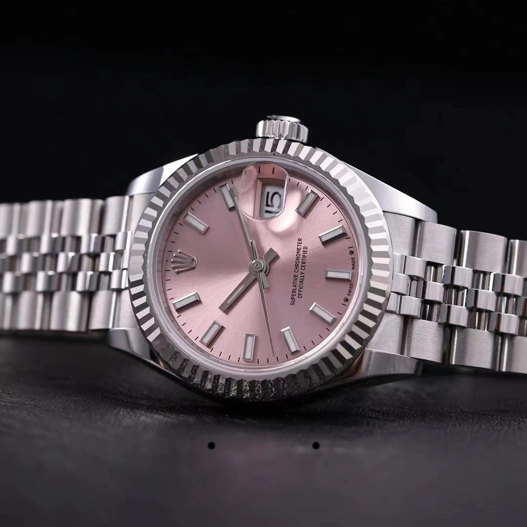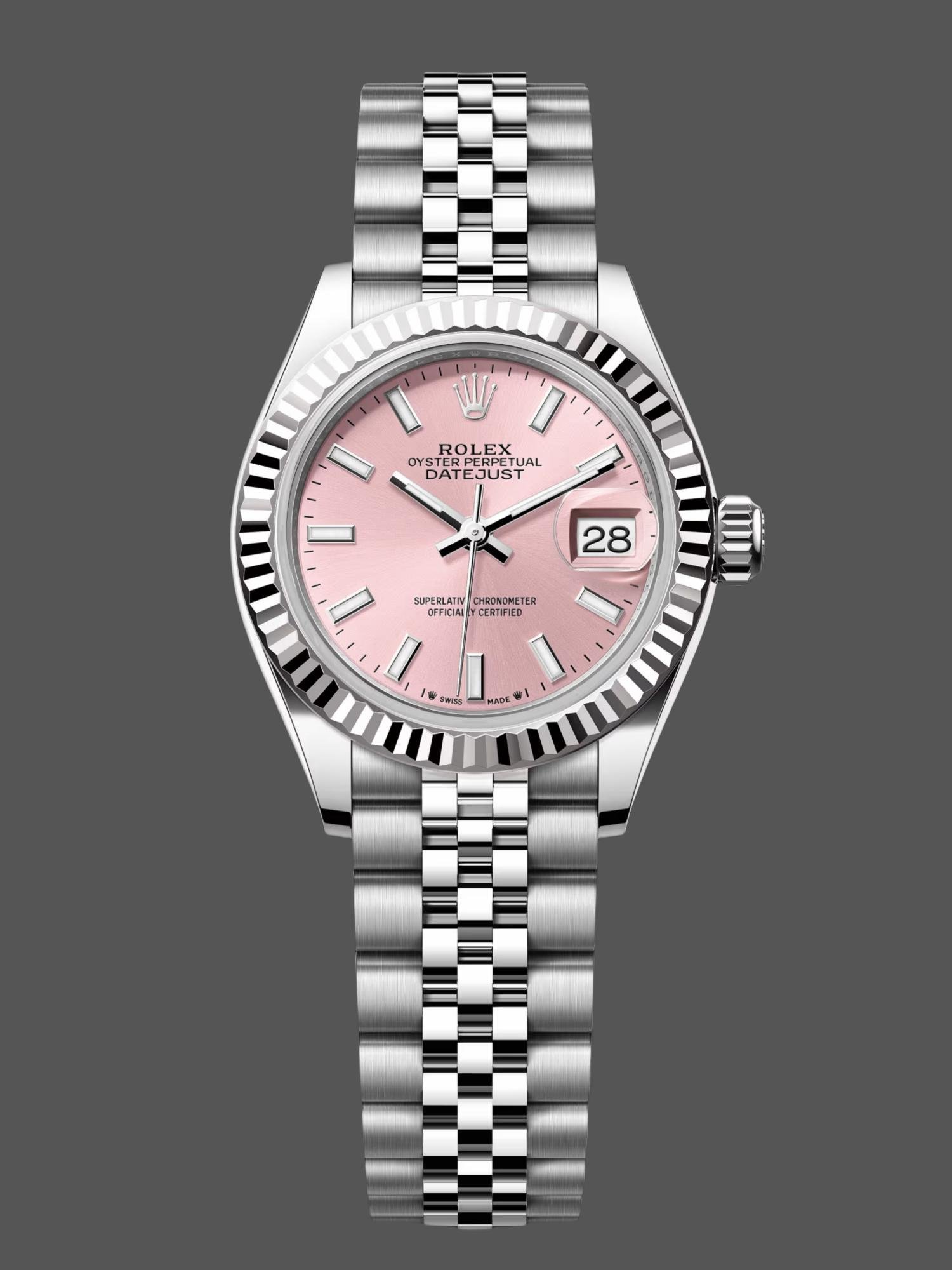 Rolex Datejust 279174, replica for women in stainless steel with pink dial and indexes, 28 mm. 28mm Oystersteel case, polished solid white gold fluted bezel. Screw-down crown with double Twinlock closure. Scratch resistant sapphire crystal with Cyclops magnifying glass. Pink dial with indexes. Calendar at 3. Oystersteel Jubilee stainless steel bracelet with hidden closure. It will look great on your wrist.