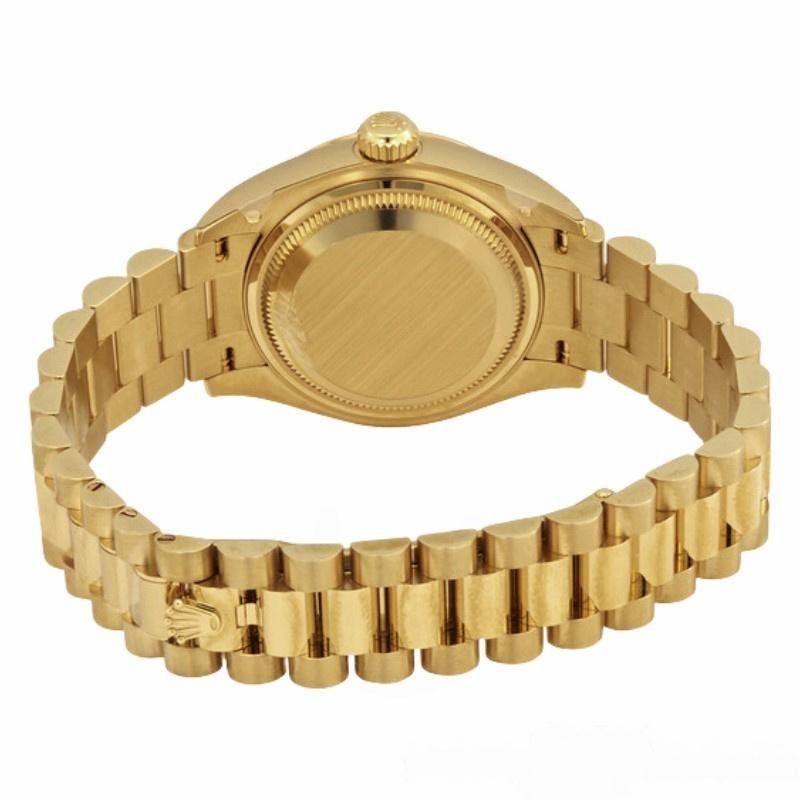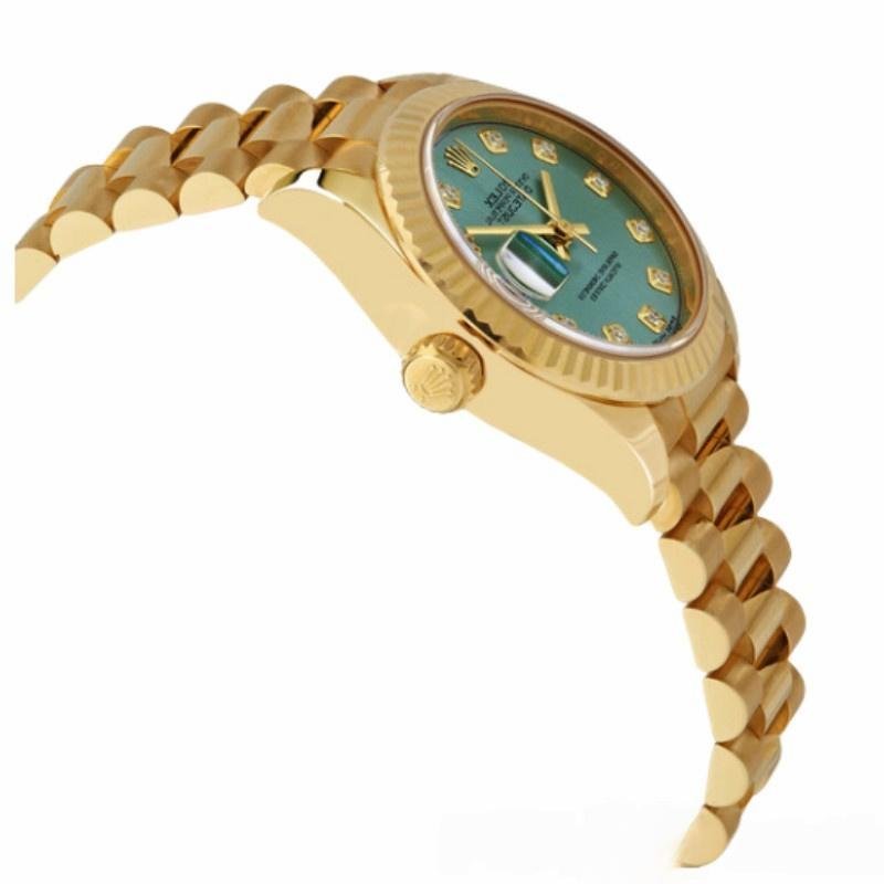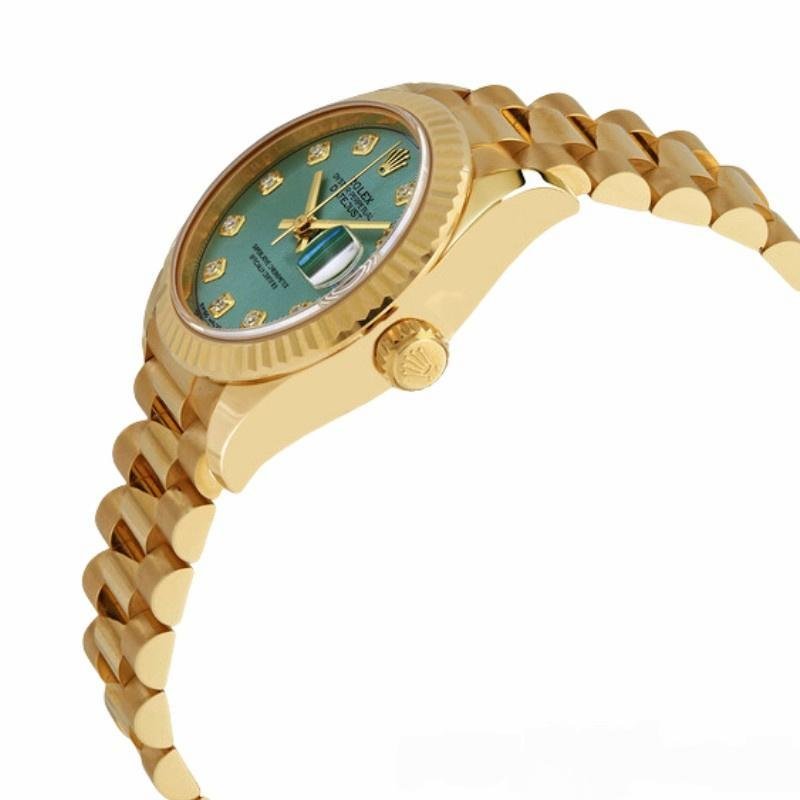 Rolex Datejust 279178 women’s watch, mint green dial with 28 mm fluted bezel, 28 mm round yellow gold case with screw-down crown and fluted bezel yellow gold. Mint green dial with diamond indexes. Date window at 3 o’clock. Yellow gold President bracelet with three-piece semicircular links and hidden Crownclasp folding clasp.